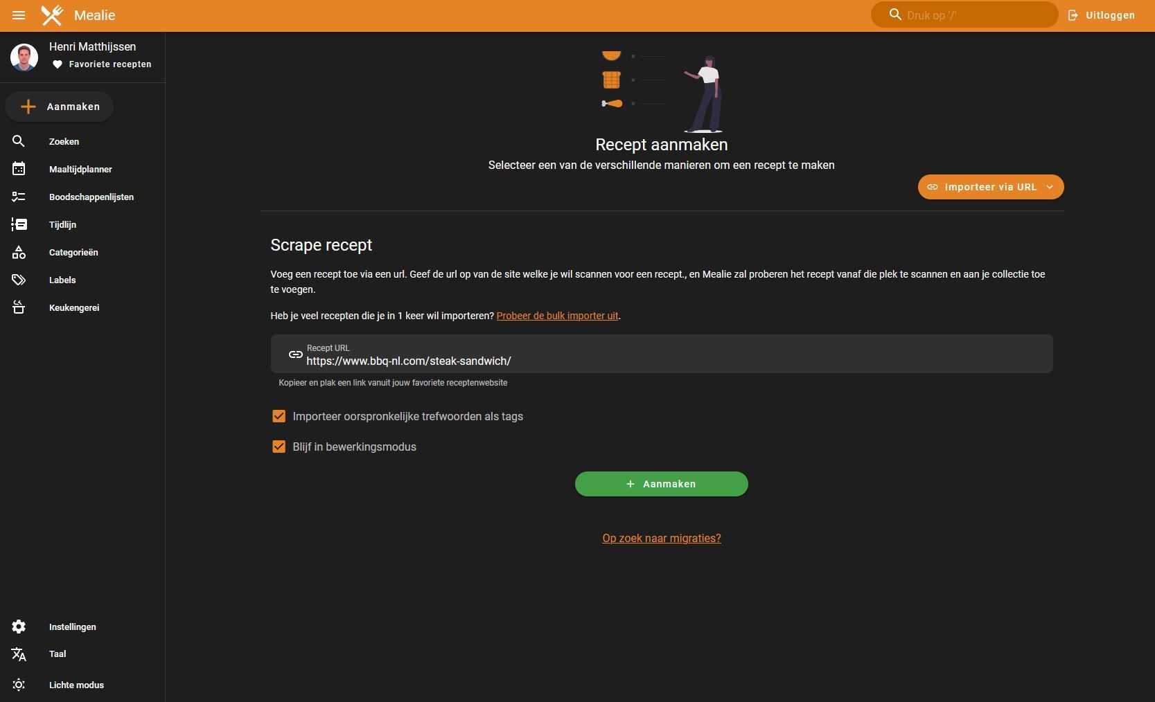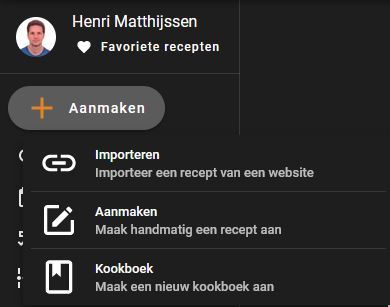 Je kunt nu recepten gaan toevoegen. Dat kan handmatig, maar je kunt ook van heel veel sites de recepten importeren. Je hoeft dan alleen maar de URL op te geven waar het recept staat: