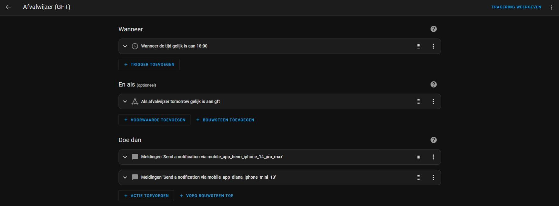 Ik heb zelf ook nog automatiseringen gemaakt dat ik de dag voor een ophaaldag een melding op onze telefoon krijg dat we het afval buiten moet zetten. Zie onderstaande voorbeeld hoe ik dit heb ingesteld: