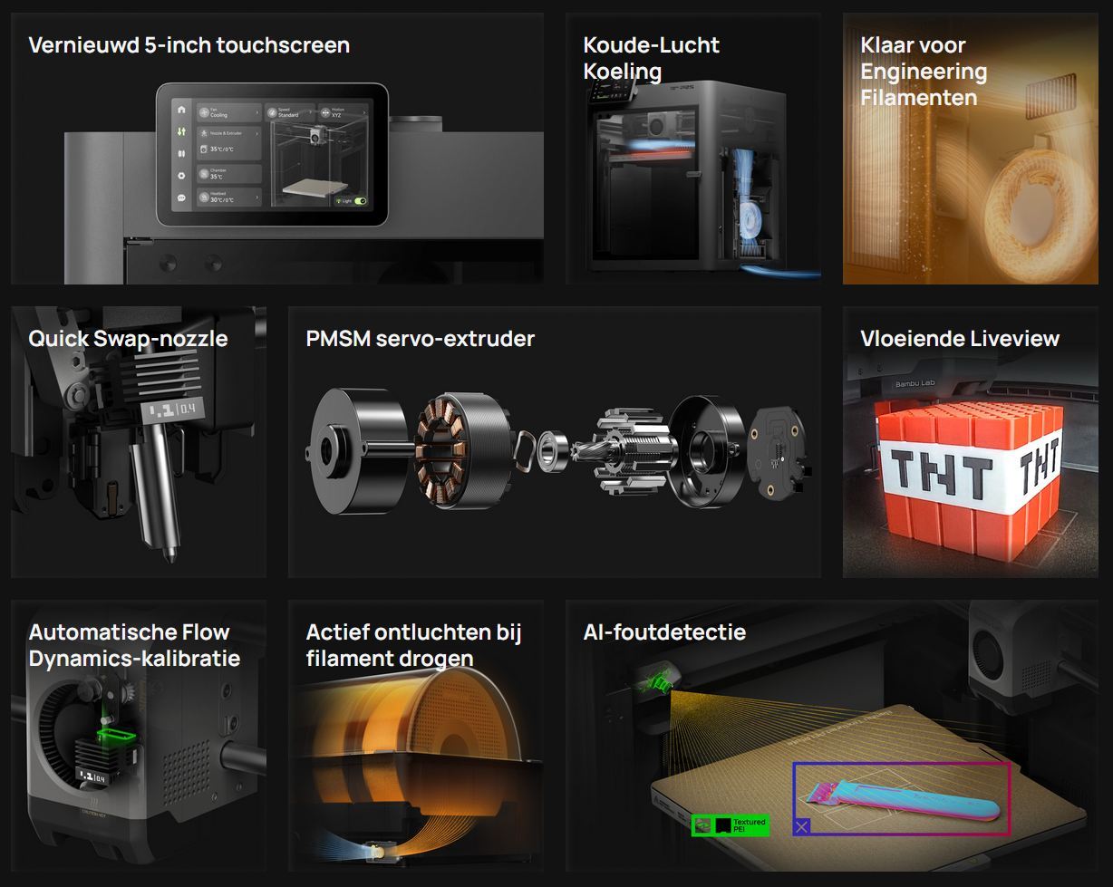 De P2S bevat een volledig bijgewerkte kleuren touchscreen en een krachtige processor. In tegenstelling tot traditionele koelsystemen die warme lucht recirculeren, zuigt het Adaptive Airflow System van de P2S koele lucht rechtstreeks aan van buiten de kamer. Dit verbetert de koelefficiëntieaanzienlijk, zodat je vol vertrouwen filamenten met lage temperaturen kunt printen met de gesloten deur— zonder je zorgen te hoeven maken over overhangende kwaliteit of verstoppingen van de nozzles.