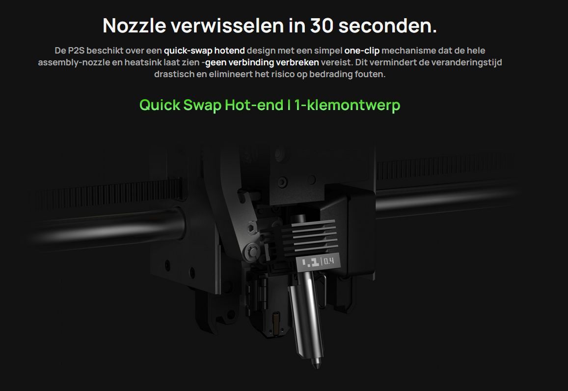 De P2S beschikt over een quick-swap hotend design met een simpel one-clip mechanisme dat de hele assembly-nozzle en heatsink laat zien -geen verbinding verbreken vereist. Dit vermindert de veranderingstijd drastisch en elimineert het risico op bedrading fouten.
