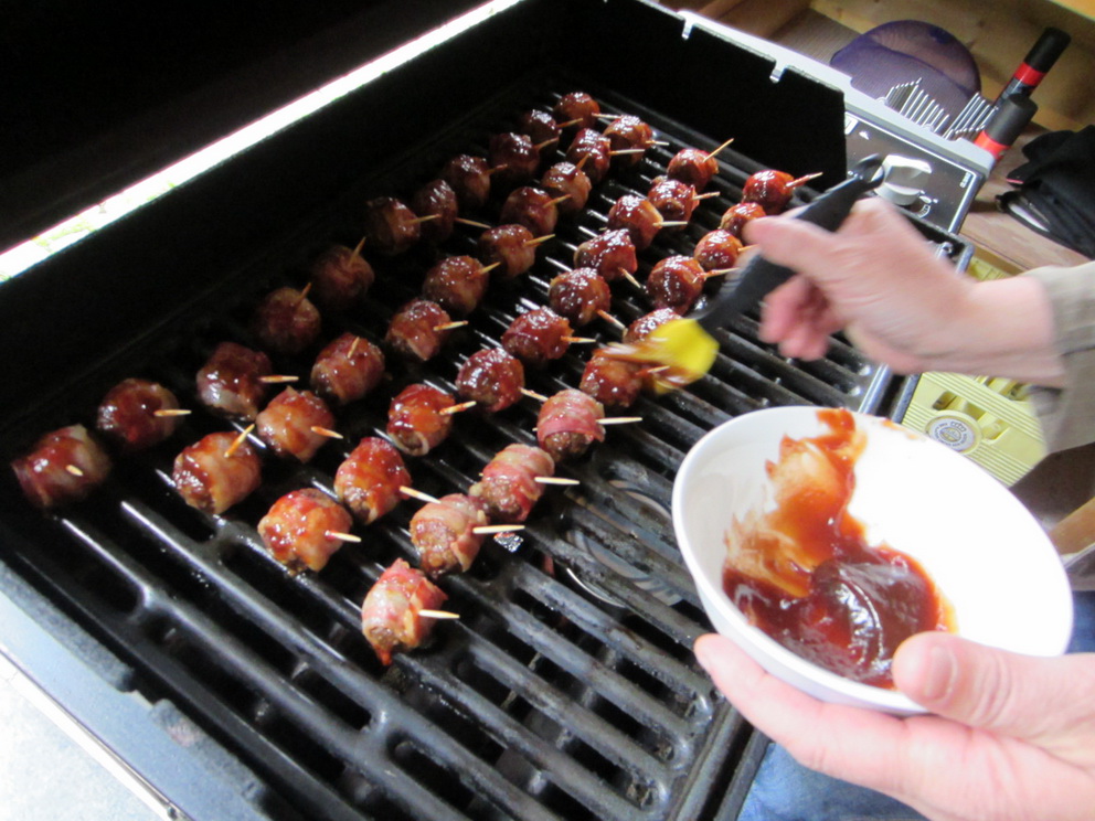 750 gram rundergehakt zakje geraspte Parmezaanse kaas (40 gram) 1 losgeklopt ei 60 gram gekruid paneermeel 2 eetlepels fijngehakte knoflook 1 theelepel zeezout 1 theelepel versgemalen zwarte peper 118 ml melk 1 theelepel gedroogde oregano 2 theelepels gedroogde peterselie ontbijtspekGooi al deze ingrediënten in een schaal en meng deze goed door elkaar. Draai hier vervolgens kleine gehaktballetjes van. Niet te groot, daar je hierna er nog ontbijtspek om moet wikkelen. Bestrooi de MOINK Balls vervolgens met je favoriete rub saus. Ik heb Big Bob Gibson rub gebruikt: Hierna moet je er ontbijtspek rond de gehaktballetjes wikkelen en met een cocktailprikkertje vastzetten. Diana had bij de Makro repen ontbijtspek gevonden wat ideaal was. Met 1 reep kun je precies 2 gehaktballetjes omwikkelen. De BBQ had ik ondertussen al voorbereid voor een indirecte sessie waarbij ik 1 gasbrander had uitgezet. De richttemperatuur is zo rond de 107o Celcius wat met de gas BBQ redelijk makkelijk is in te stellen. Ik heb voor de smaak nog een “rookpot” met hickory hout op de gasbrander gezet. Vervolgens de BBQ klep sluiten en 1½ uur laten liggen. Ik ben er lekker bij gaan zitten met een biertje om de temperatuur in de gaten te houden. Het is jammer dat er geen “geur internet” bestaat, want het ruikt heerlijk!
