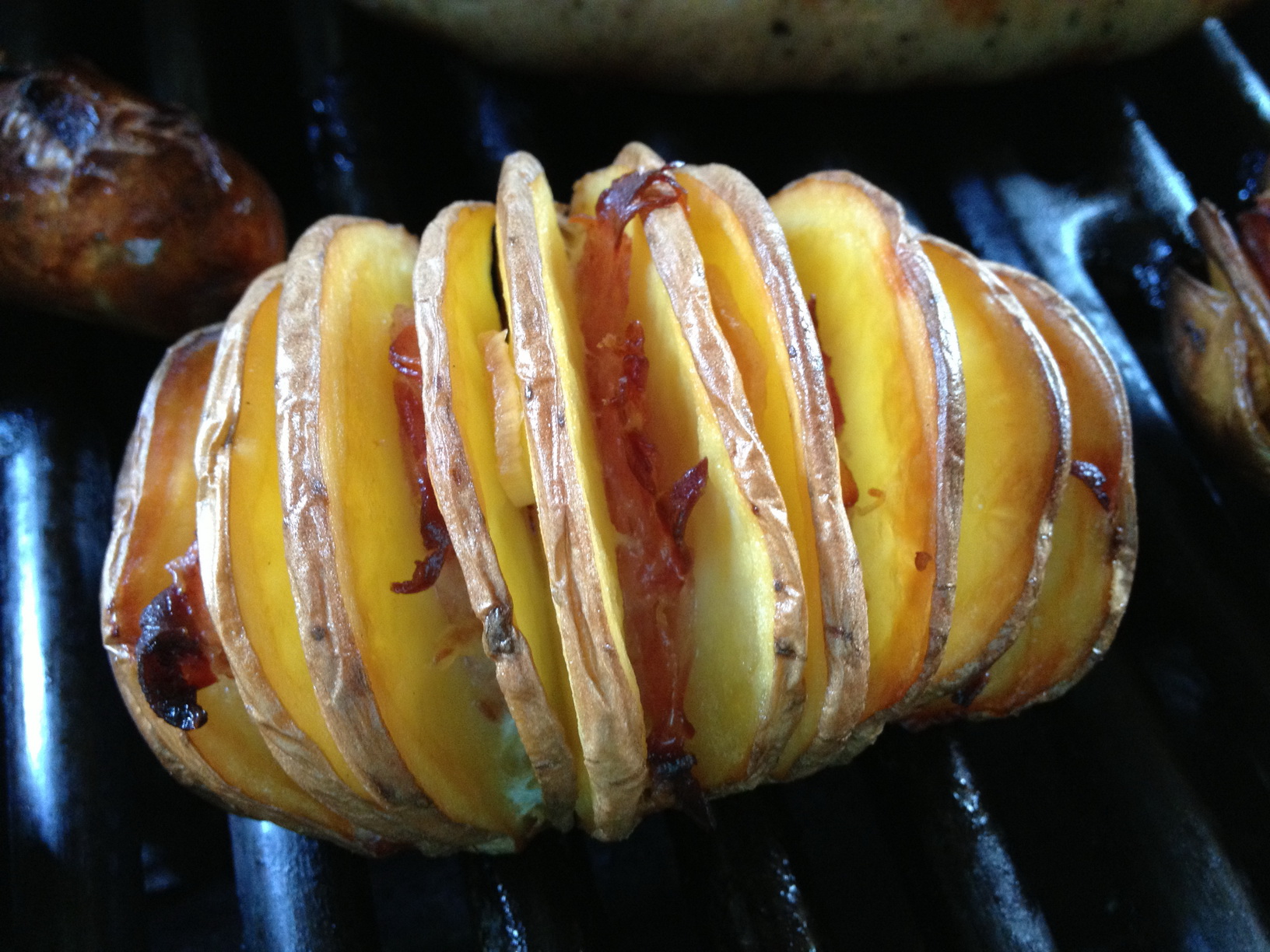 Op internet kun je diverse Nederlandstalige BBQ blogs vinden. Hierop kom je vaak leuke ideeën en recepten tegen. Op de blog van Mac’s BBQ Pit kwam ik het recept van Hasselback aardappels tegen en dat leek ons wel wat. Het idee is dat je een aardappel om de 3-4 mm. insnijdt en hierin knoflook en bacon legt.