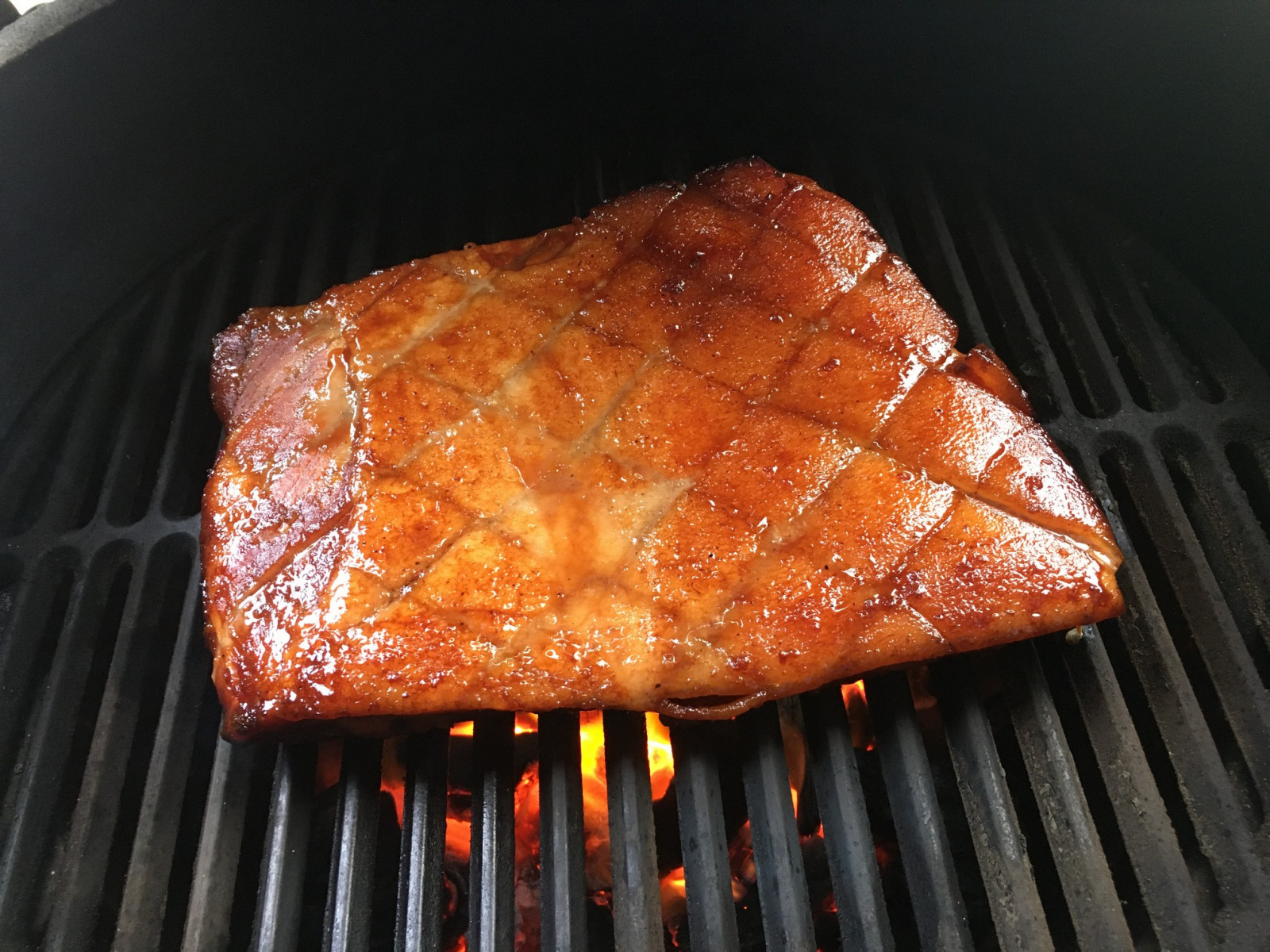Bereid nu je BBQ voor op indirect grillen. Ik heb hierbij een temperatuur ingesteld van 105o C. Leg de buikspek met de vetrand naar boven op de BBQ.