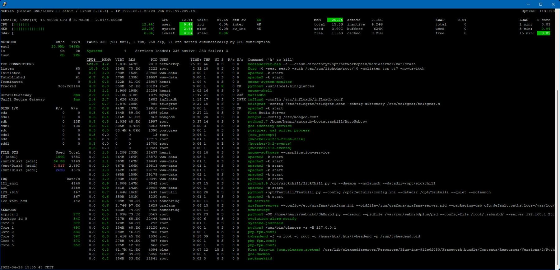 Met de tool bpytop kun je handig je Debian server monitoren. Het is een variant op de bekende ‘htop’, ‘iotop’, en ‘apachetop’ tools. Om deze tool te installeren gebruik je het commando: