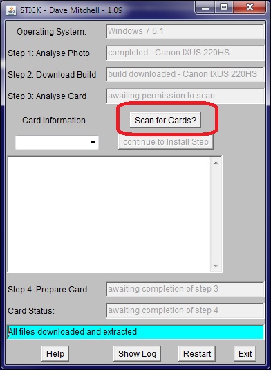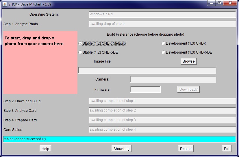 De software runt vanaf je de SD Card en zal dus niet je camera aanpassen/beschadigen. Om de CHDK software op je SD Card te krijgen is een handige tool beschikbaar met de naam STICK die draait onder Java. M.b.v. STICK prepareer je dus je SD Card met de CHDK software.