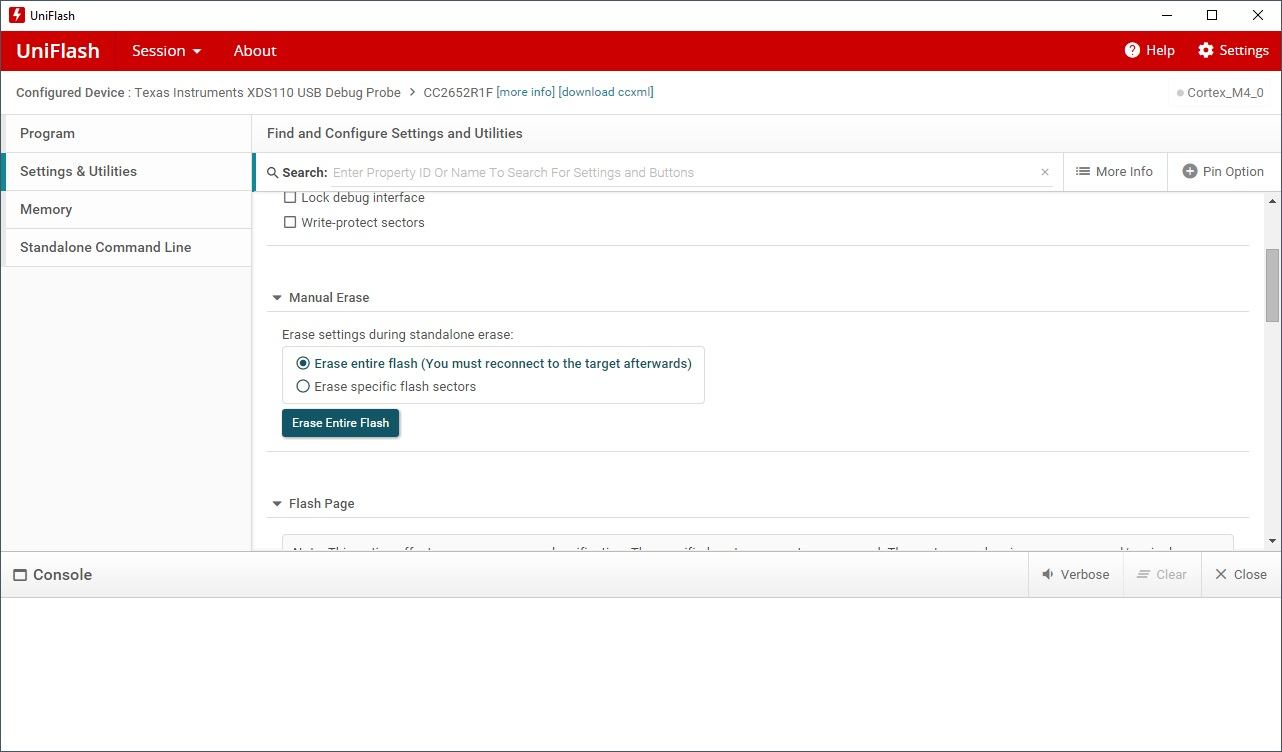- Wis de inhoud van de CC26X2R1 door te kiezen: “Settings & Utilities” menu, kies optie “Erase entire flash (You must reconnect to the target afterwards)” bij de ‘manual erase section’ en voer de actie uit. Ik kreeg nog de vraag om een update uit te voeren en dat heb ik gedaan. Hierna heb ik nogmaals een ‘Manual Erase Entire Flash’ gedaan.