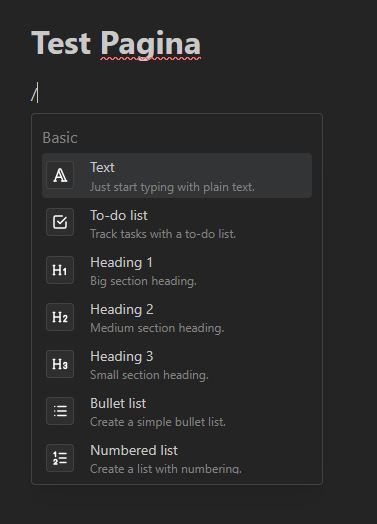 Vervolgens kun je pagina’s toevoegen. Geef de pagina een titel en voeg je content toe. Met het ‘/’ karakter kun je diverse data op een handig manier toevoegen aan je pagina.