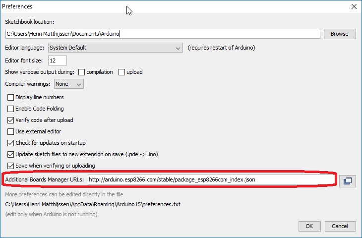 Het aansturen van het relais is heel eenvoudig. We gebruiken hiervoor de Arduino IDE software die je hier kunt downloaden. Voordat we aan de slag gaan moet we nog wat instellingen in de Arduino IDE veranderen. Vul bij ‘File > Preferences’ voor ‘Additional Boards Manager URLs’ de volgende waarde in: