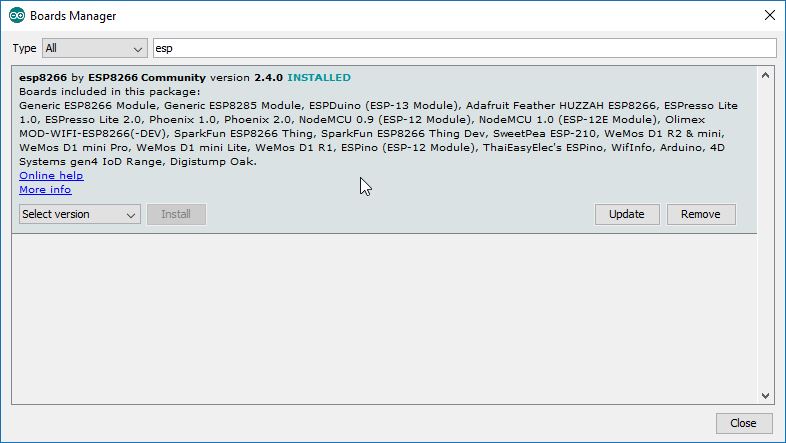 Ga naar Open Boards Manager vanaf ‘Tools > Board’. Scroll naar beneden en selecteer ‘esp8266 by ESP8266 Community’. Kies nu ‘install’.