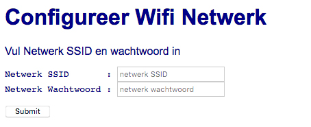 Initiëel zal je ESP8266 opstarten als een Access Point (AP Mode). Wacht totdat je ‘eGarageOpener’ ziet verschijnen bij je draadloze netwerken. Maak verbinding met de SSID ‘eGarageOpener‘ en vul voor wachtwoord ‘eGarageOpener’ in. Ga vervolgens met je browser naar 192.168.4.1 en vul de Wifi gegevens van je lokale Wifi netwerk in en druk op [Submit].