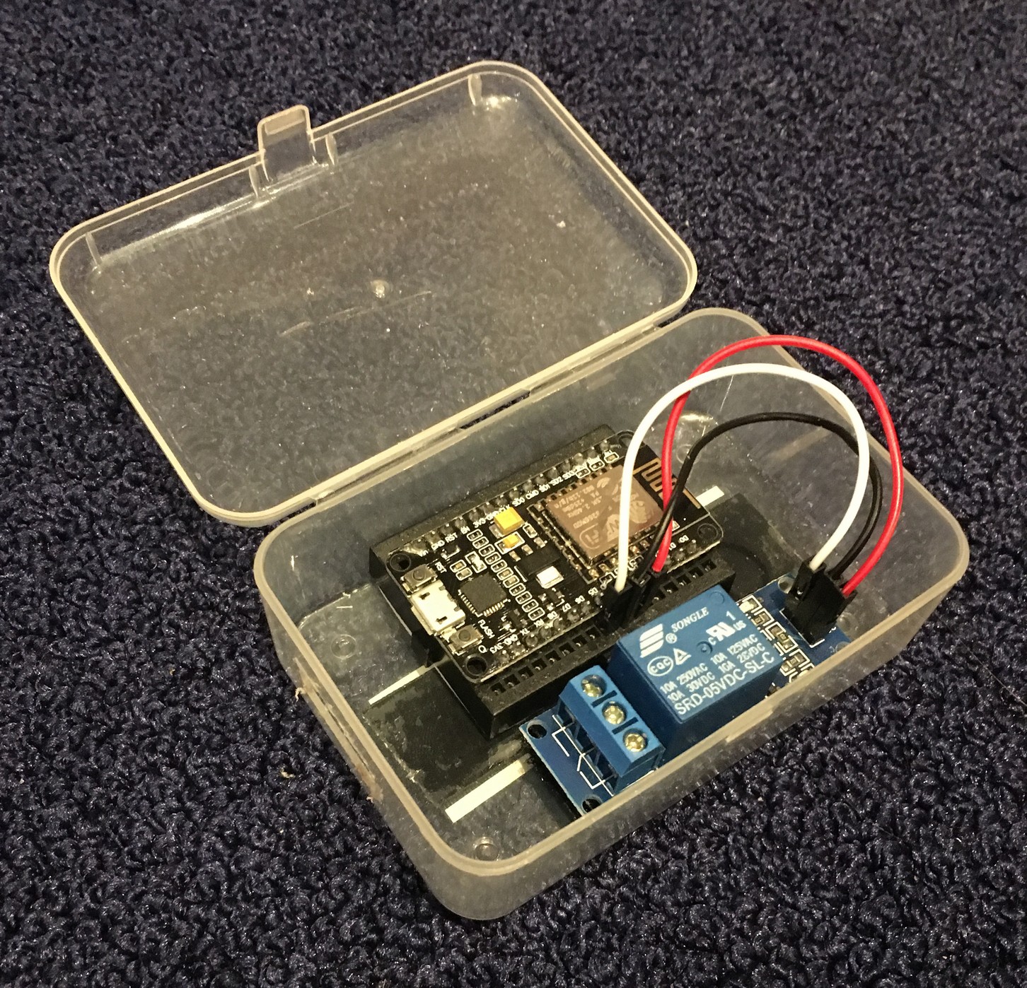 De ESP8266 kun je met USB van power voorzien (5V) en het relais is weer met de ESP8266 verbonden.