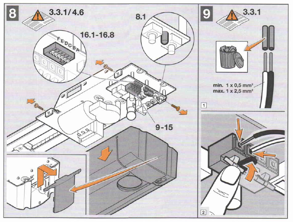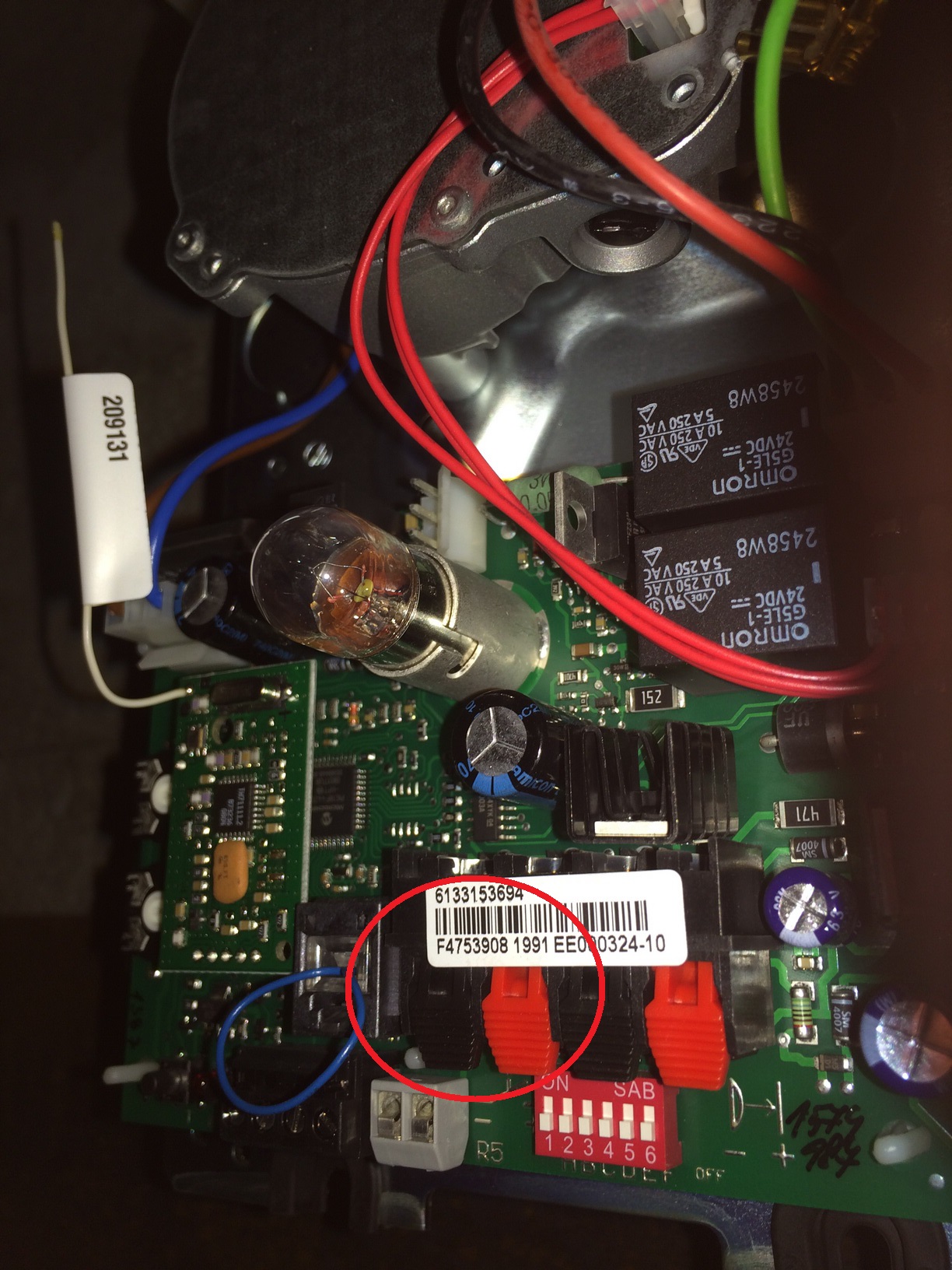 Als je de Promatic Garagedeur Aandrijving opent dan zie je dat je het relais op de rood omcircelde connectors hieronder moet aansluiten.