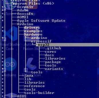- Download Arduino-ESP32 package en unzip deze in de installatie directory van je Arduino IDE in de volgende sub-directory ‘\hardware\espressif\esp32’