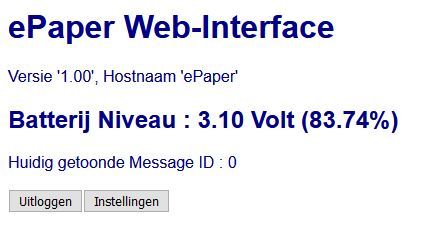 Op de web-interface zie je huidige batterij niveau en index van welk message er op het display wordt getoond. Tevens kun je hier naar het [instellingen] menu gaan.
