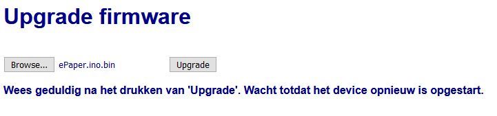 Kies de file-naam van je ‘bin’ en druk op de [Upgrade] knop. Na 1 minuutje zal je ESP32 van nieuwe software zijn voorzien en automatisch worden herstart. Indien de major versie (getal voor de punt) van ‘ePaper’ is veranderd dan zal de software weer in AP mode opstarten en worden alle instellingen gereset. Je moet dan alles weer opnieuw instellen. In alle andere gevallen blijven al je instellingen gewoon behouden.