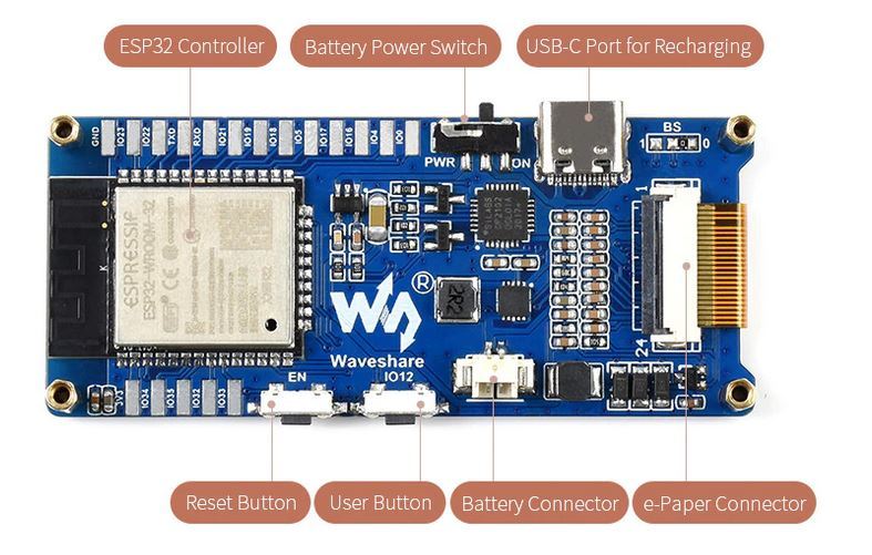 Deze set bevat naast het ePaper display ook nog een ESP32 module en Li-po 3.7V 2000mA batterij. De ESP32 heeft Wifi/Bluetooth aan boord, dus het draadloze aspect is helemaal gewaarborgd. Voor ongeveer Euro 24,= kun je deze set kopen.