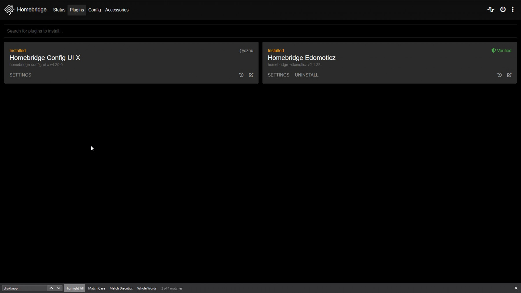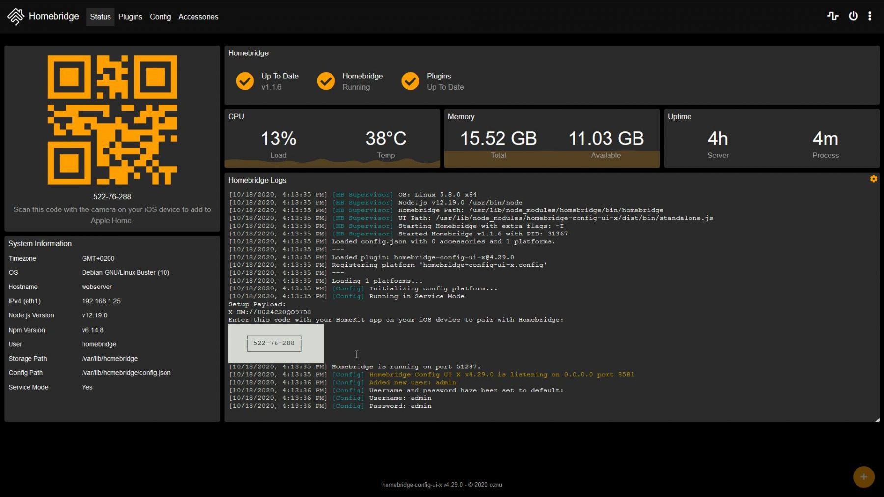 Als je bovenstaande stappen hebt uitgevoerd dan kun je ‘Homebridge Config UI X’ bereiken op URL: