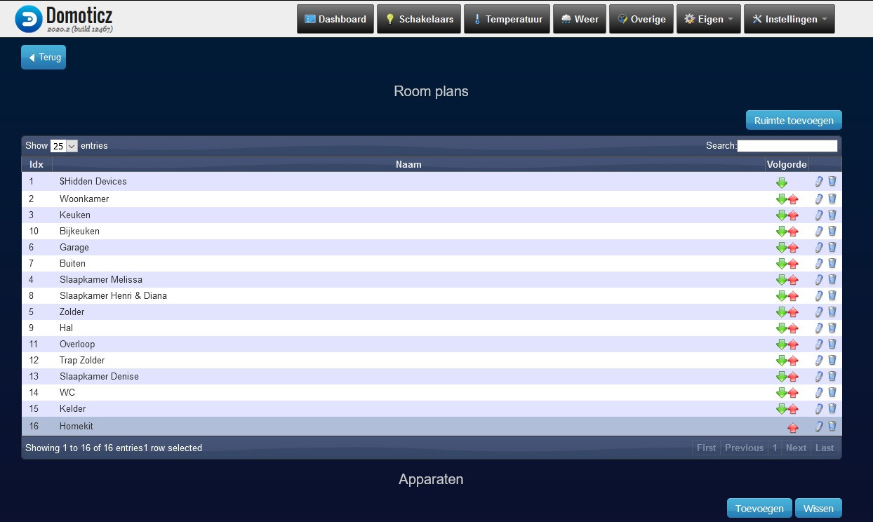 Om je Domoticz apparaten te kunnen bedienen moet je de eDomoticz plugin installeren. Voordat je dit doet moet je beseffen dat je in Homekit een maximum heeft aan apparaten dat het ondersteunt. Het is daarom verstandig om een aparte ‘ruimte’ in je Domoticz te maken met alleen die devices die je met Homekit wilt bedienen (in onderstaand screenshot heb ik ruimte ‘Homekit’ aangemaakt met idx=16).