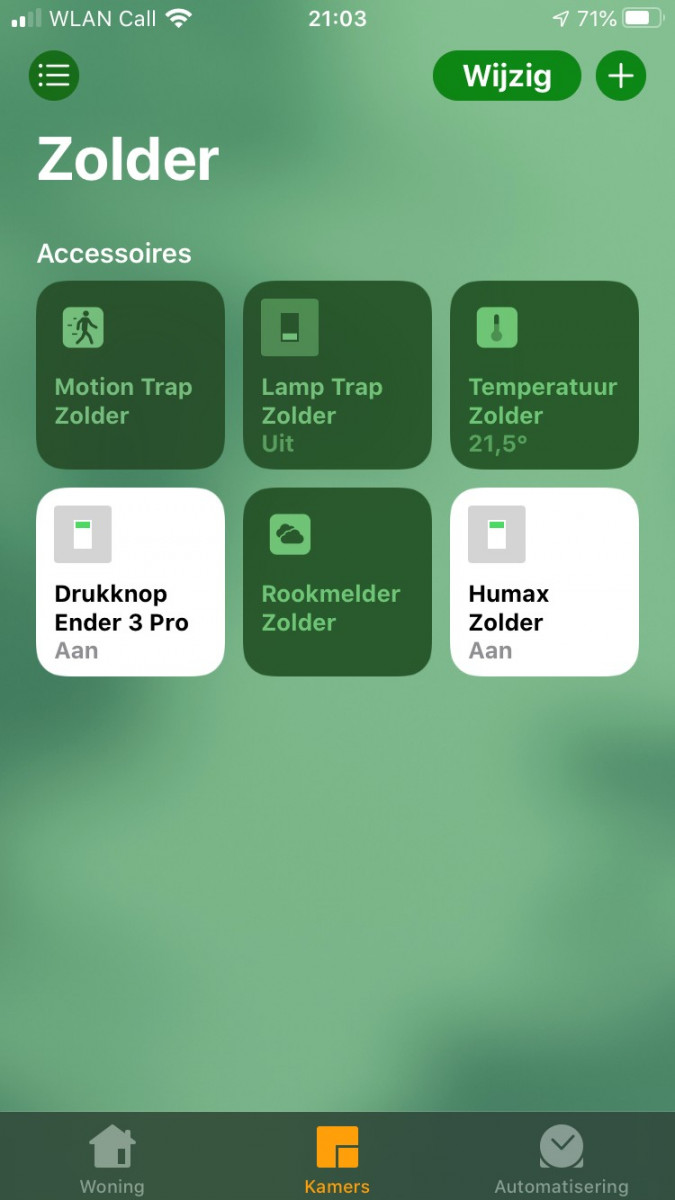 Als je al je nieuwe apparaten hebt toegevoegd kun je deze gebruiken in Homekit. Hieronder zie je een voorbeeld van een kamer.