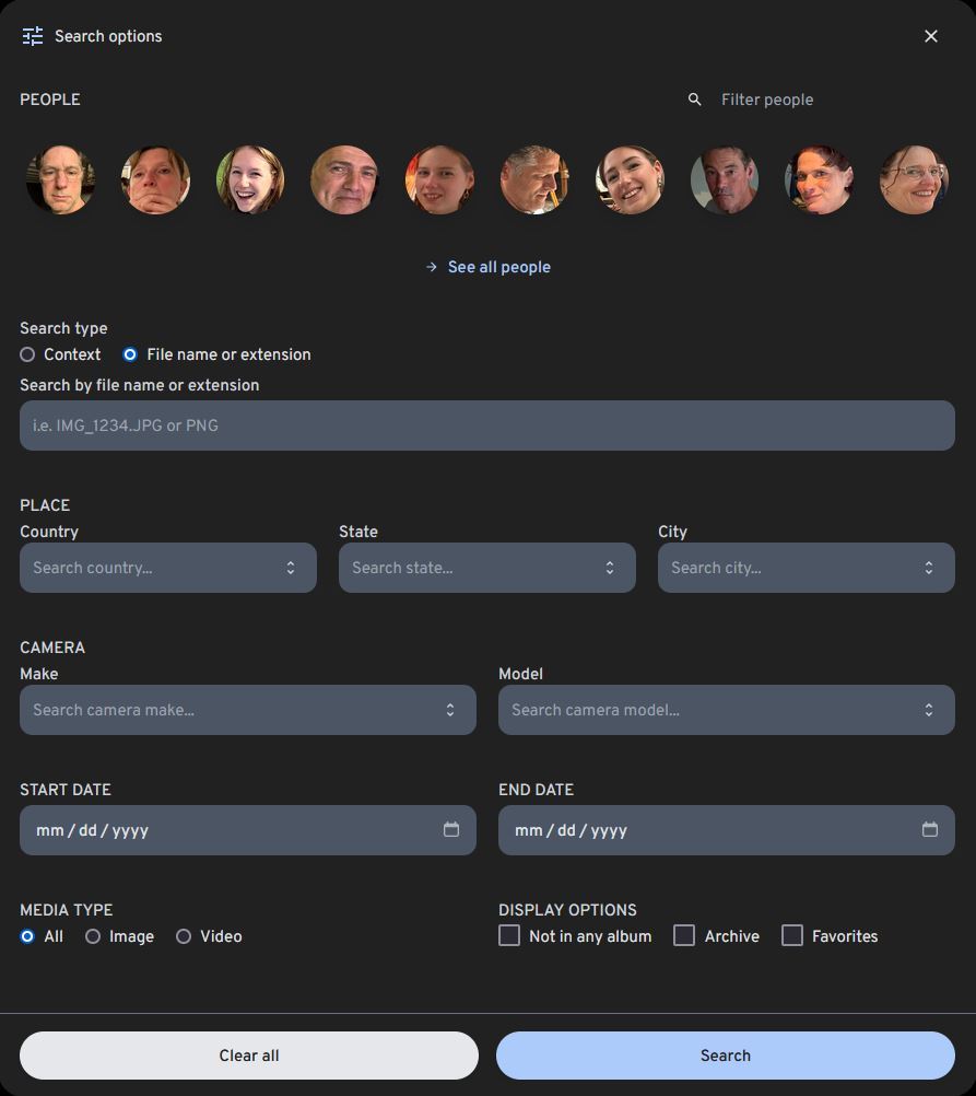 Immich werkt ontzettend handig en mooi en je kunt snel je foto’s terugvinden op allerlei manieren (tijdlijn, search, etc.). Zie hieronder bijvoorbeeld de search options: