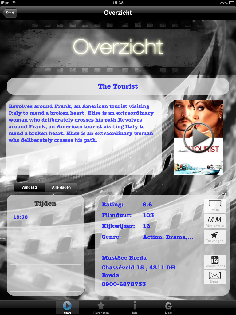 Alle de bioscopen bij je in de buurt. Verder kun je bij elke bioscoop zien welke films er draaien en op welk tijdstip.