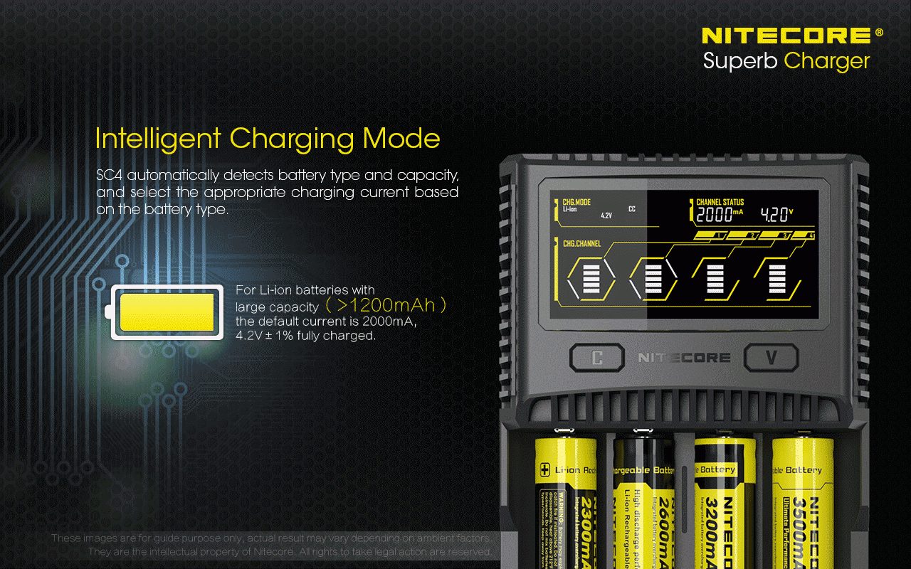 De SC4-oplader is compatibel met de volgende Li-ion / IMR / LiFePO4-batterijen: 10440, 10500, 12340, 12500, 12650, 13450, 13500, 13650, 14350, 14430, 14500, 14650, 16500, 16340 (RCR123), 16650, 17350, 17500, 17650, 17670, 18350, 18490, 18500, 18650, 22500, 22650, 25500, 26500, 26650. Daarnaast kunnen de volgende NiMH (NiCd) -cellen worden gebruikt: AA, AAA, AAAA, C en D.