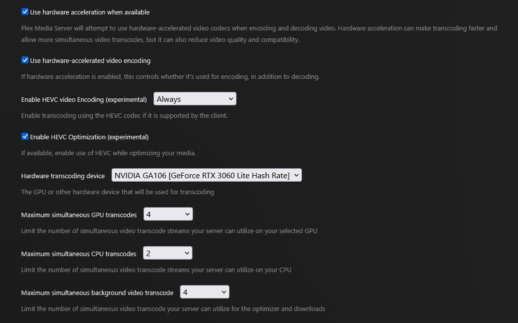 Ga verder in Plex zelf naar ‘Instellingen > Server > Transcoder’ en Enable de volgende settings: