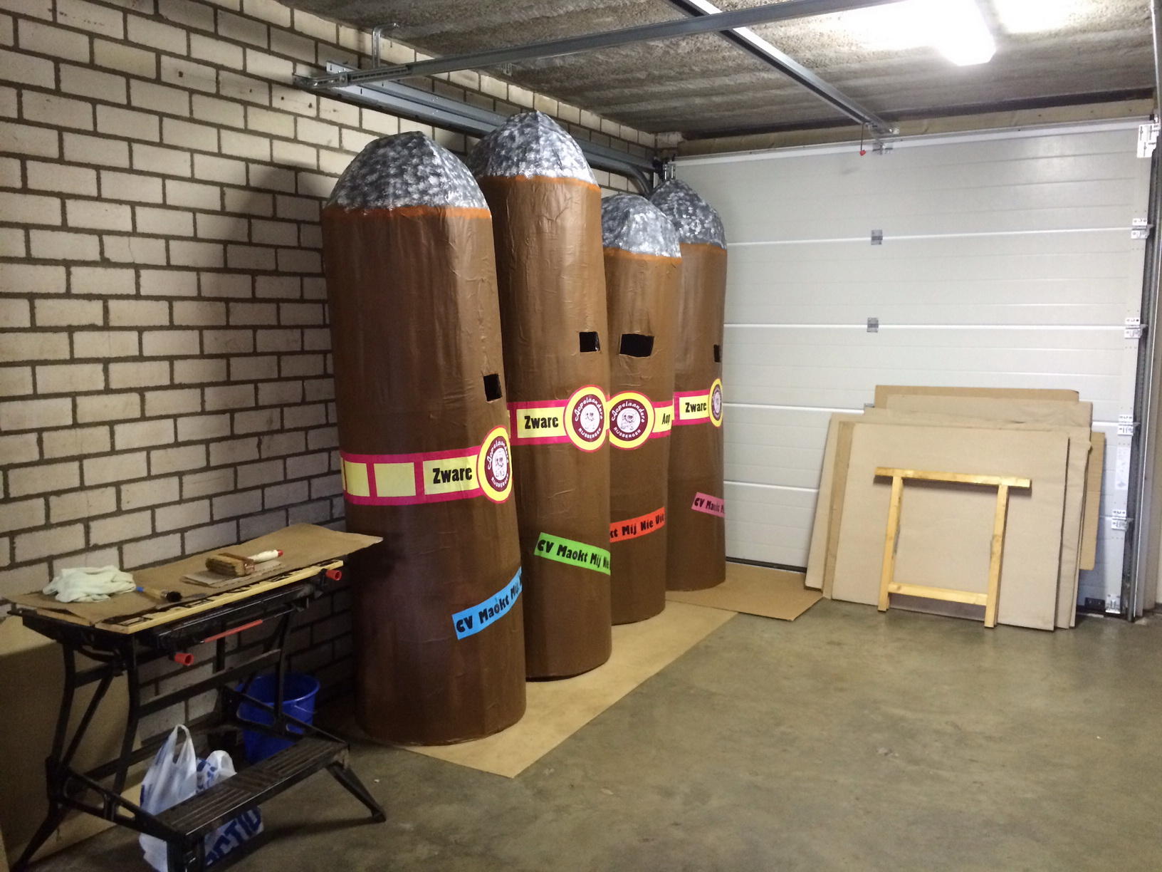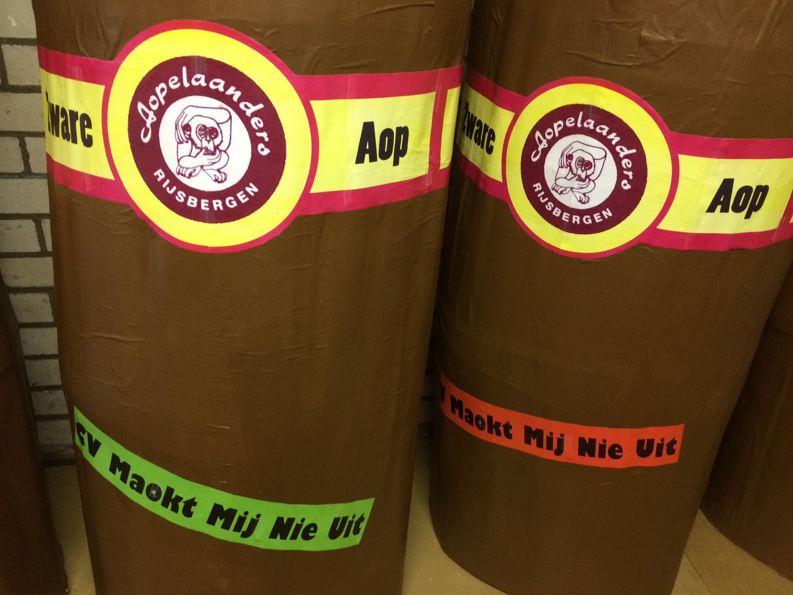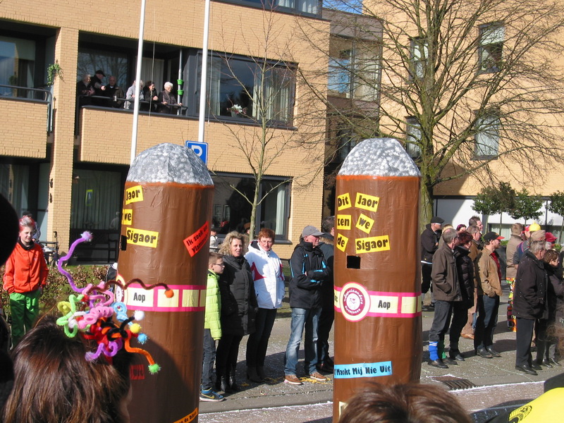 Vervolgens moest hierover karton gespannen worden met vele rollen plakband. Hierna hebben we op het karton nog 2 lagen met velletjes geplakt met behanglijm. Nadat dit alles gedroogd was kon er de verf op. Dat is gemakkelijk bij een sigaar: de kleur bruin! Hierna nog de as op de kop van de sigaar schilderen en een mooi sigarenbandje eromheen maken en de creatie is klaar. In totaal hebben we toch wel 5 bouw-sessies gehad, maar dit is altijd erg gezellig. Verder zijn we traditioneel op vrijdagavond de kroegen in Rijsbergen gaan ‘verkennen’.Op zondag was tenslotte de optocht waar we weer veel plezier hebben gehad.