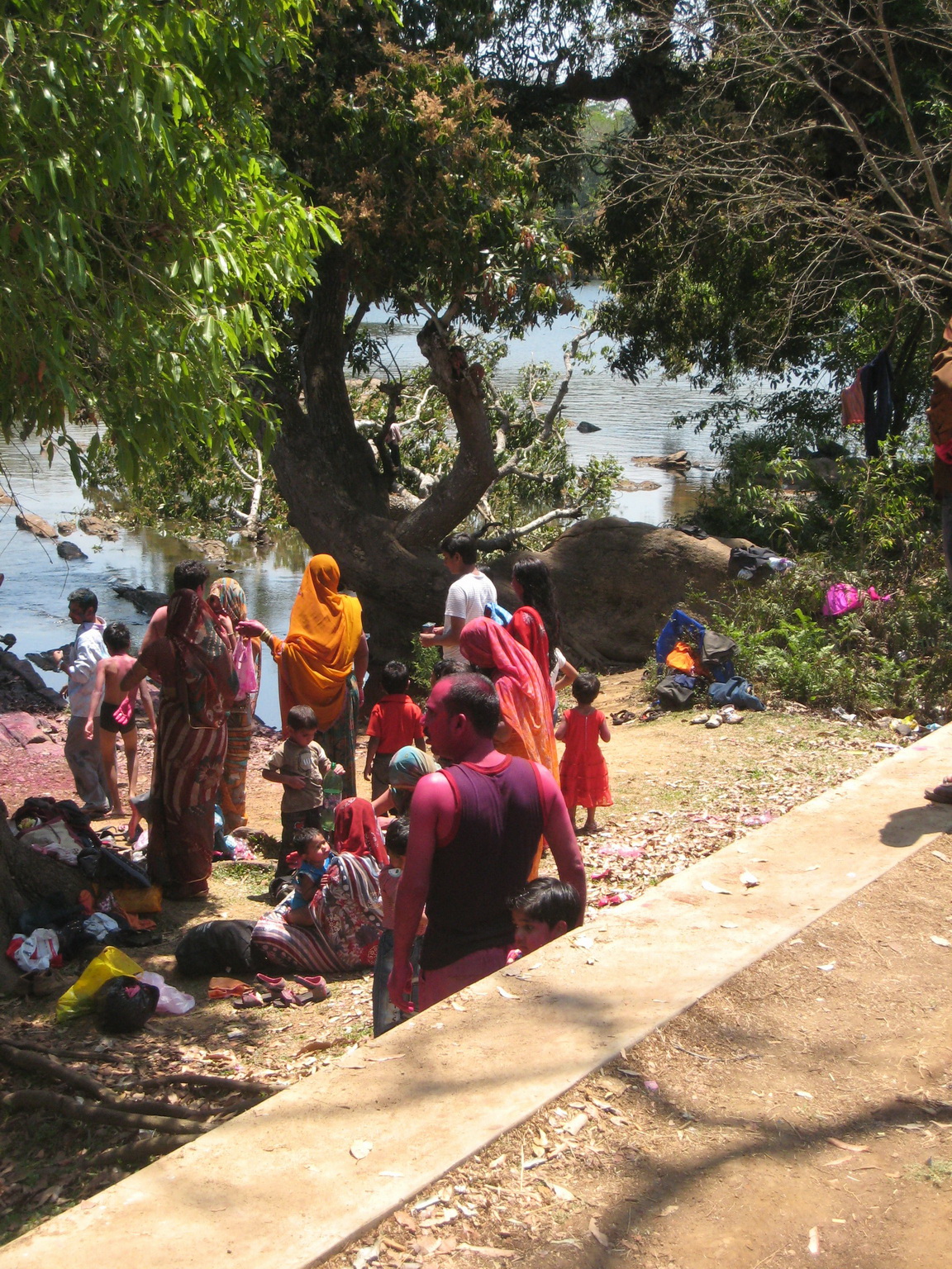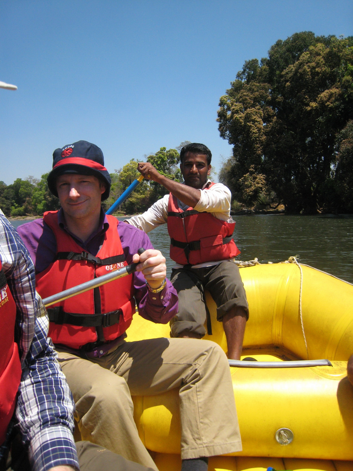 Hier zagen we dat de zogenaamde Holi Celebration bezig was. Wellicht ken je dat nog wel van de reclame waarbij mensen zich met allerlei kleuren ‘besmeren’. In dit geval waren veel mensen helemaal rood. Een erg apart gezicht. Hierna zijn we gaan raften. We moesten hierbij dus peddelen in een grote rubberboot. Het was erg warm, maar grappig om te doen. Hierna weer wat gedronken om naar de volgende bezienswaardigheid te gaan: de Golden Temple of Kushalnagar. Het hele terrein is gestart als een soort vluchtelingenkamp (en dat is het in zekere zin nog steeds) voor mensen uit Tibet die de situatie in hun land willen ontvluchten. Je vindt hier o.a. een Boedhistisch klooster (voor 5000 monikken) en een indrukwekkende gouden tempel. Deze bezienswaardig was erg indrukwekkend en de “muziek” die de monikken maken zal je leven lang bijblijven:Tijdens het gehele weekend werd alles door Pai betaald en het heeft ons dan ook niets gekost (zelfs de hotelovernachting niet)! We hebben dus weer een indrukwekkend staaltje van Indische gastvrijheid meegemaakt.