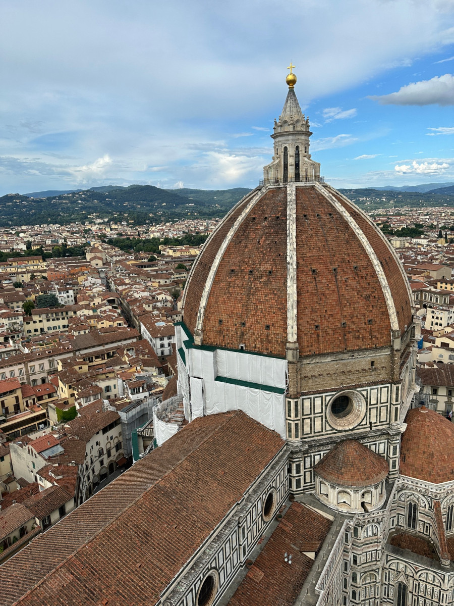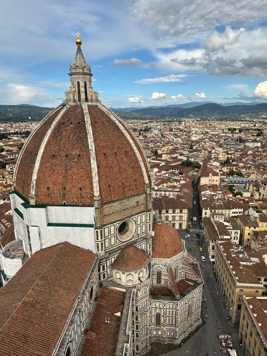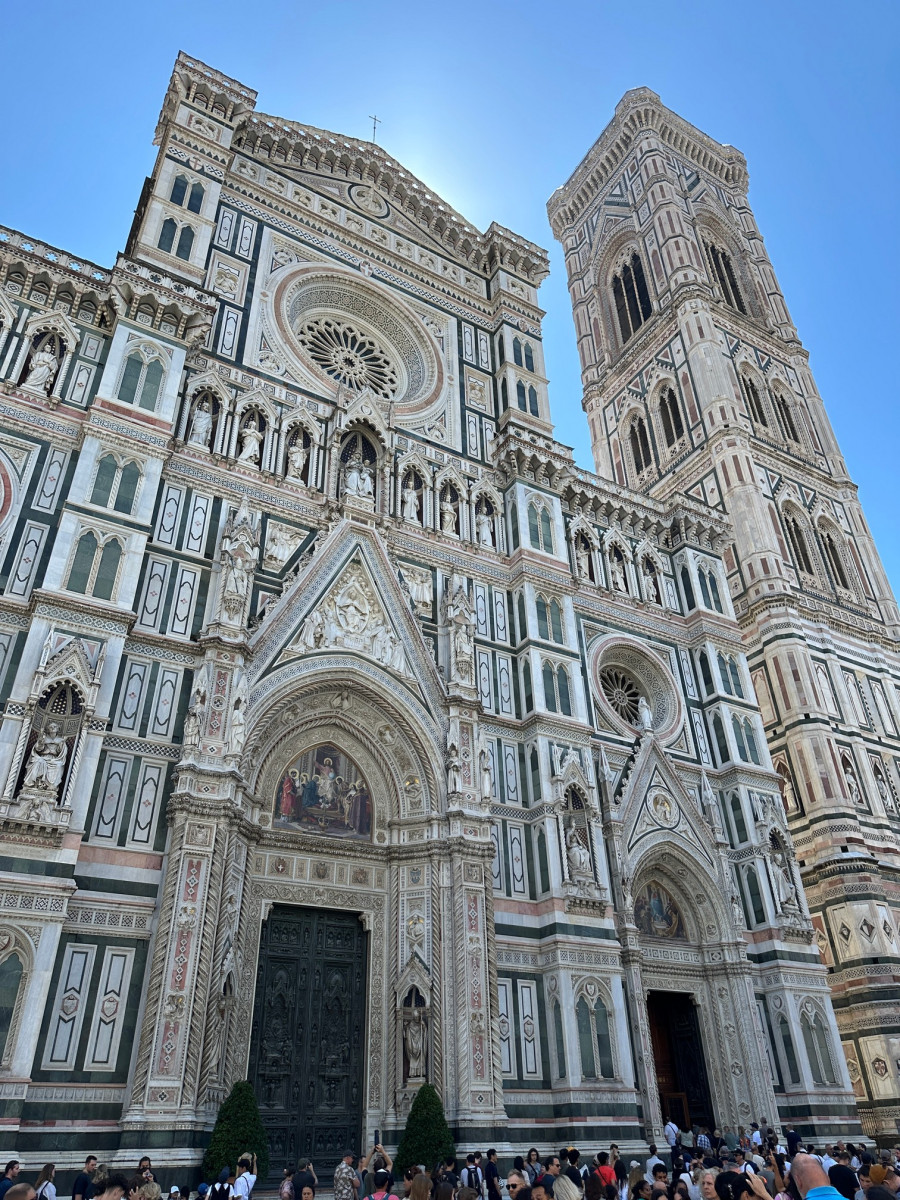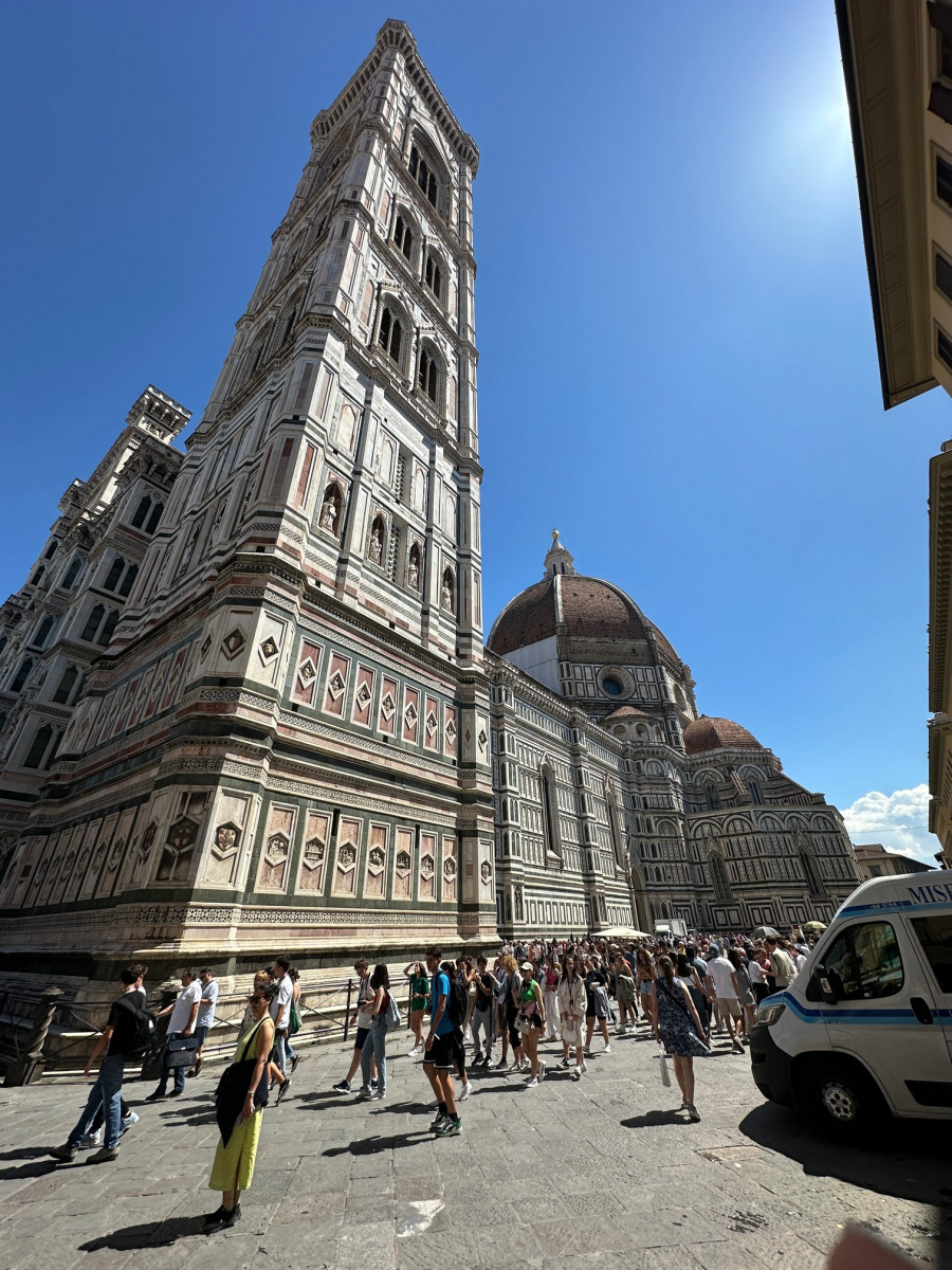De 115 meter hoge koepel van de Duome van Florence en de ernaast staande Campanile bepalen de Florentijnse skyline al eeuwen. Je merkt wel dat er erg veel toeristen zijn, ondanks het vroege tijdstip.