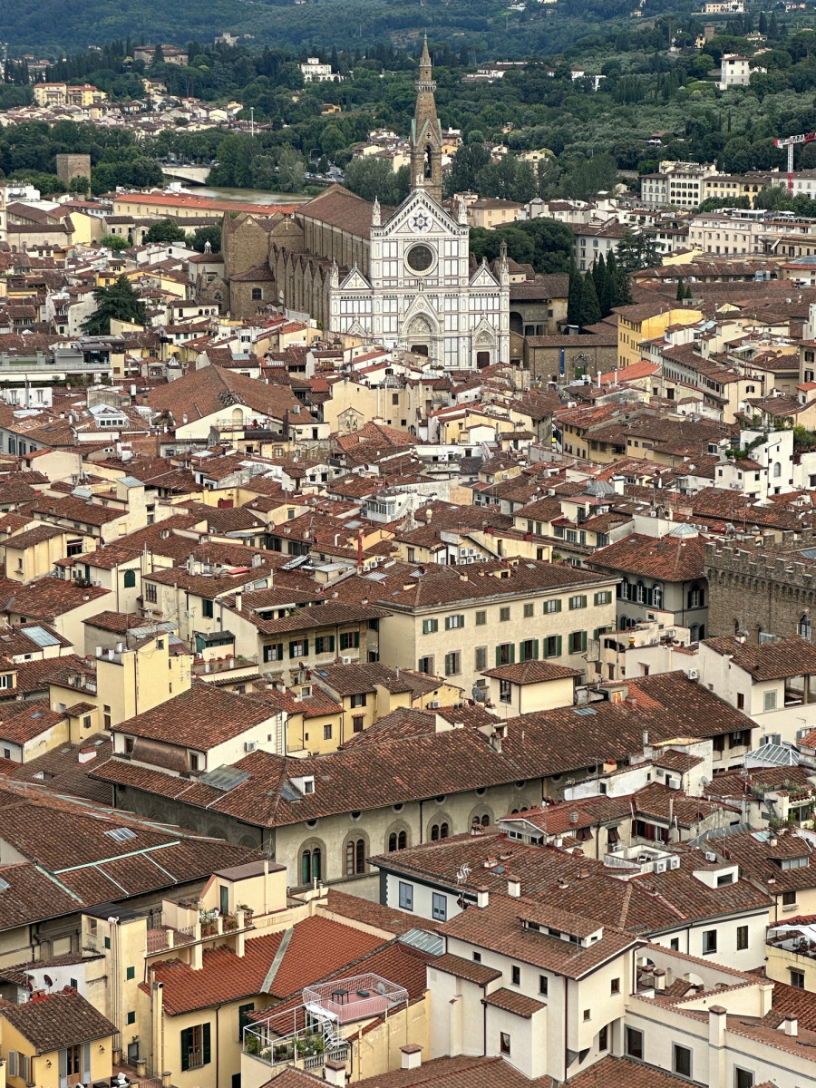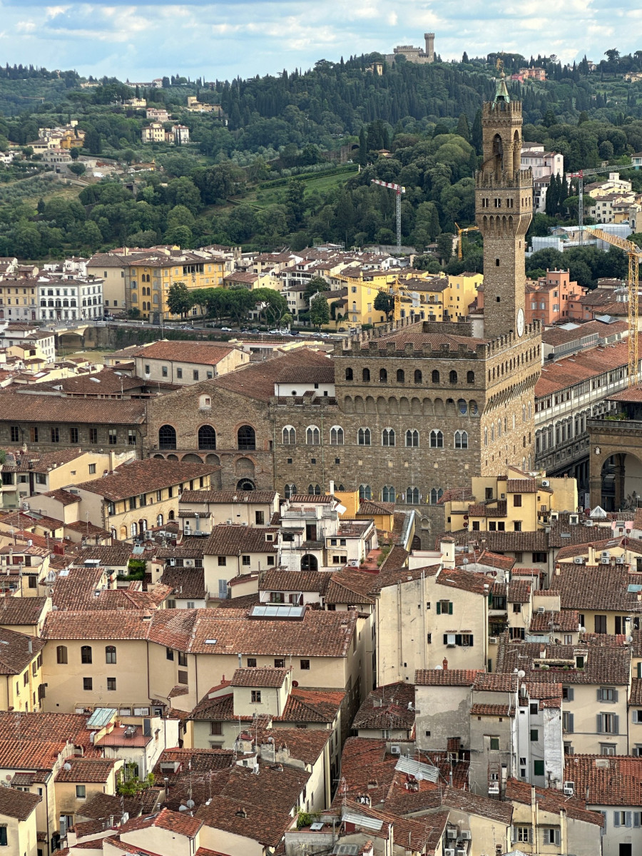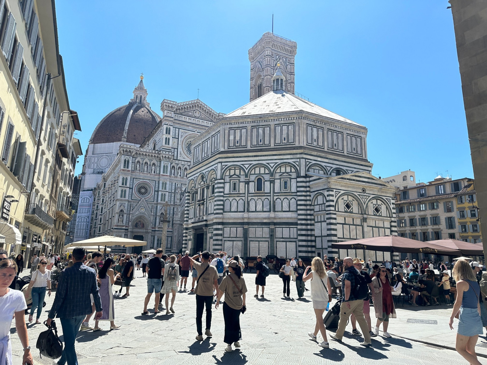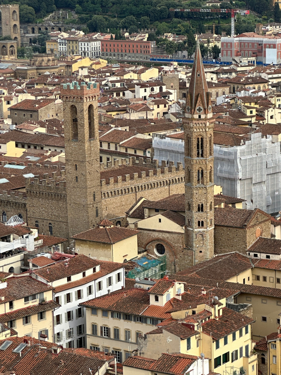 De 115 meter hoge koepel van de Duome van Florence en de ernaast staande Campanile bepalen de Florentijnse skyline al eeuwen. Je merkt wel dat er erg veel toeristen zijn, ondanks het vroege tijdstip.