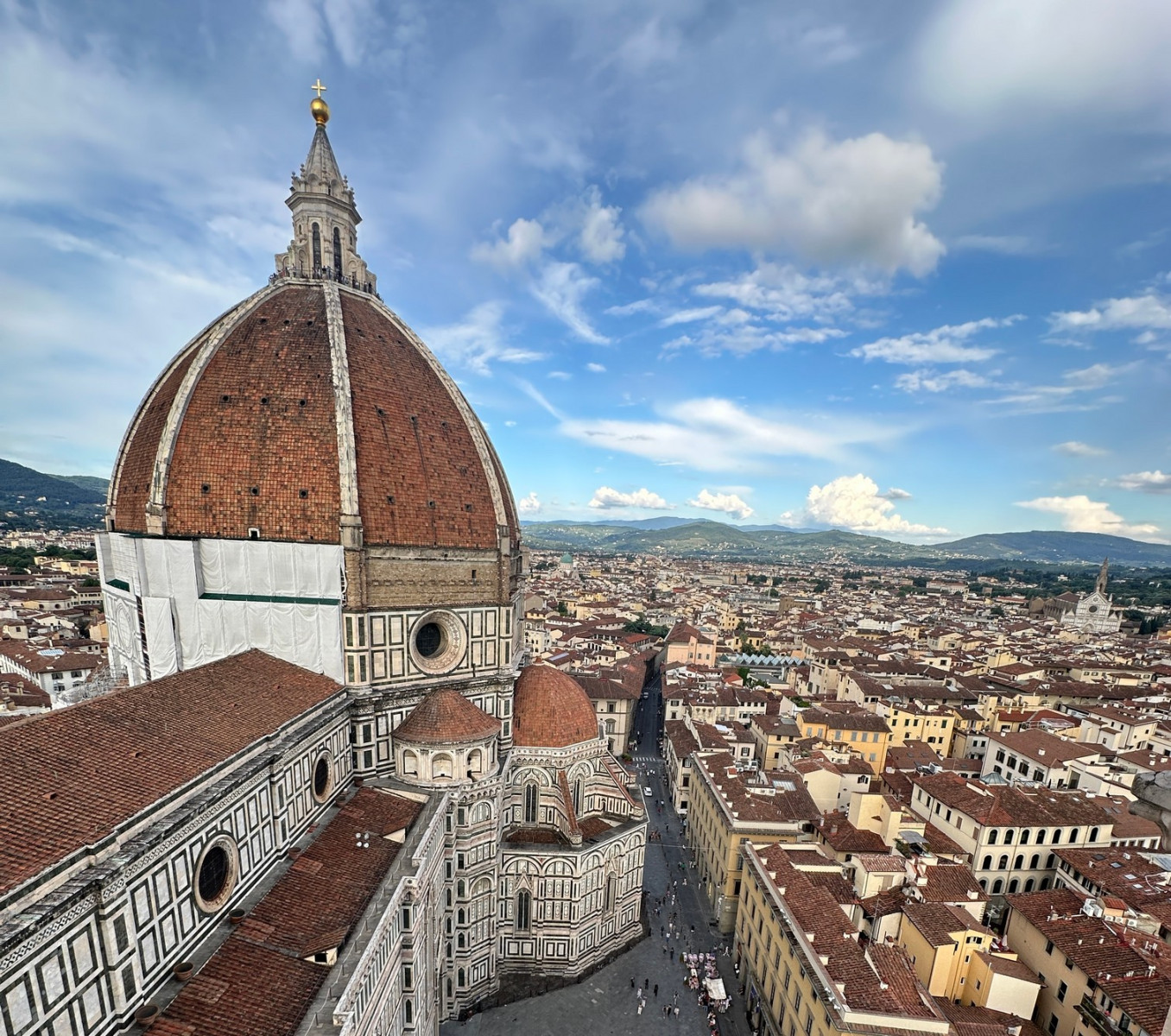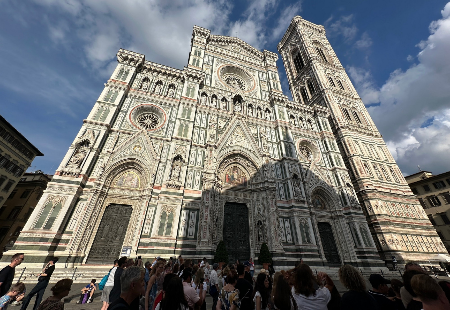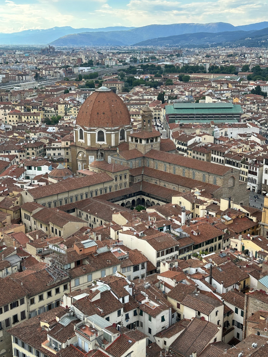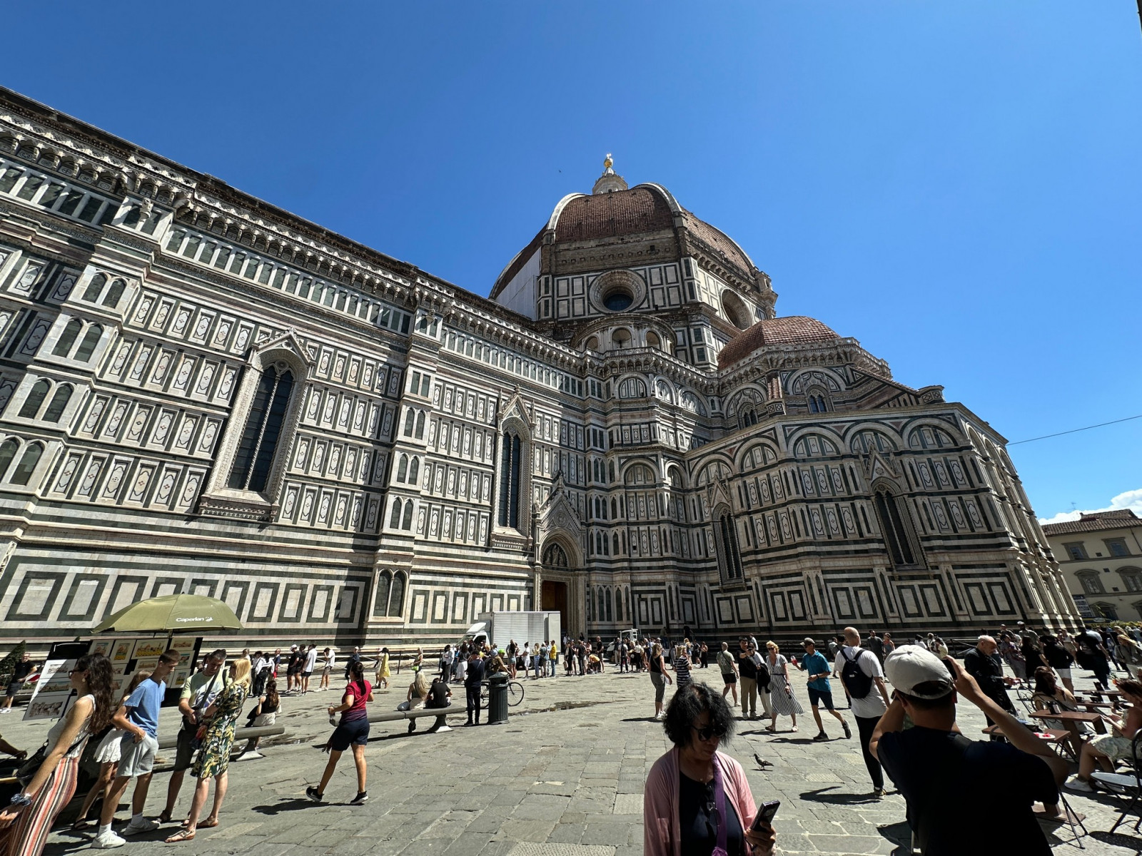 De 115 meter hoge koepel van de Duome van Florence en de ernaast staande Campanile bepalen de Florentijnse skyline al eeuwen. Je merkt wel dat er erg veel toeristen zijn, ondanks het vroege tijdstip.