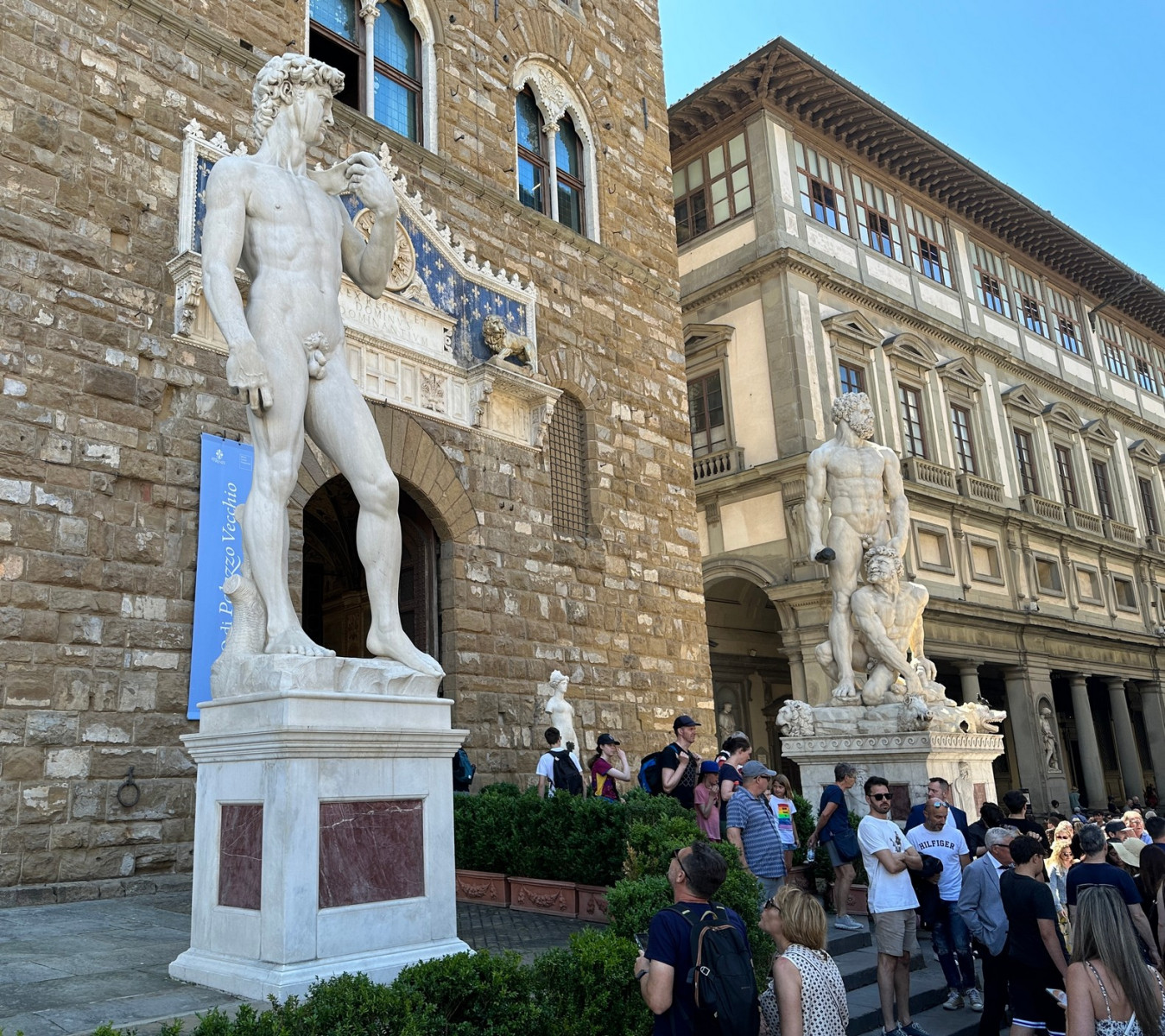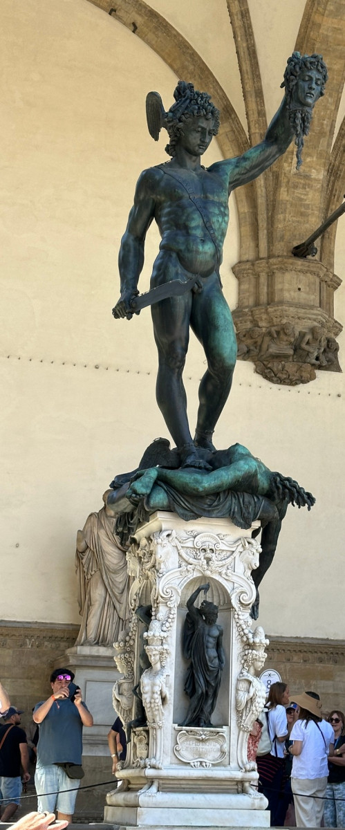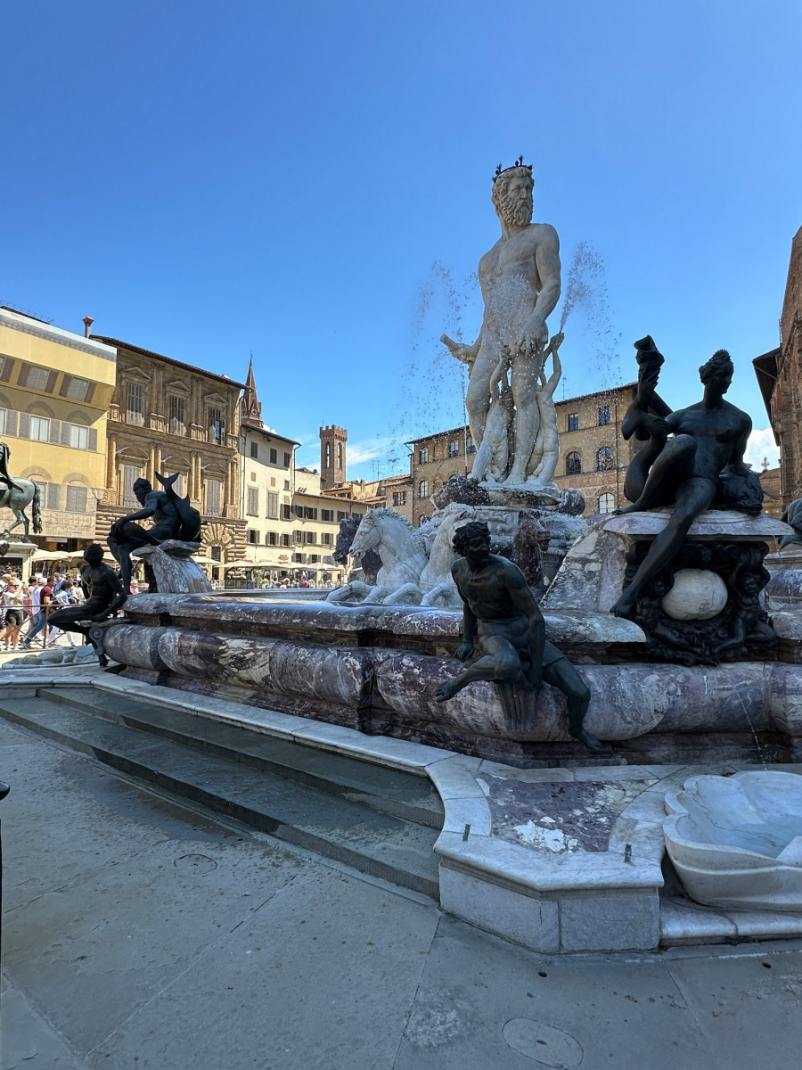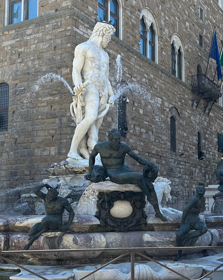 Voor het Palazzo Vecchio staat een negentiende-eeuwse replica van Michelangelo’s David. Tevens vind je op het plein de fontein van Neptunus en het hoofd van Medusa wat door Perseus was onthoofd.