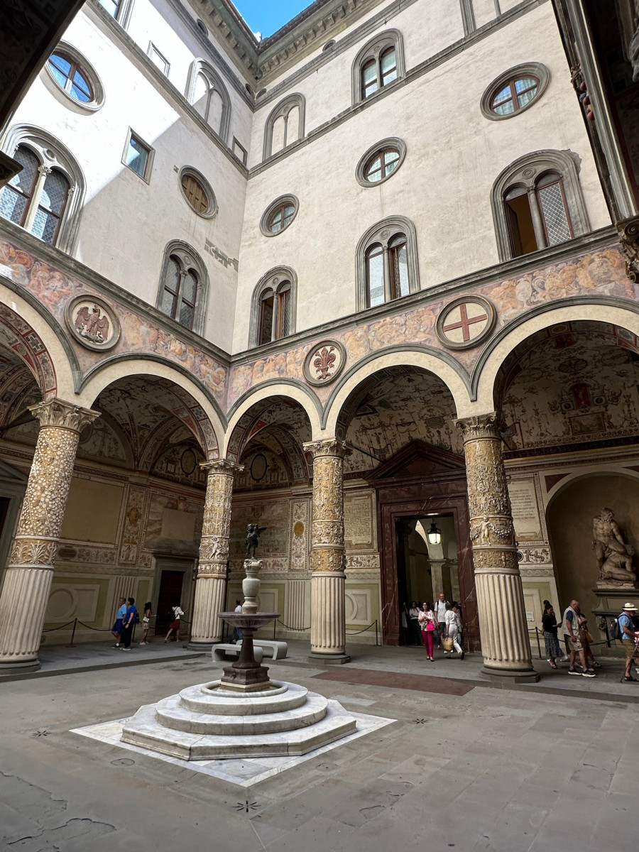 We lopen naar Palazzo Vecchio wat eeuwenlang het belangrijkste paleis van Florence is geweest. Tegenwoordig doet het dienst als museum en kun je gedeeltes binnenin gratis zien.