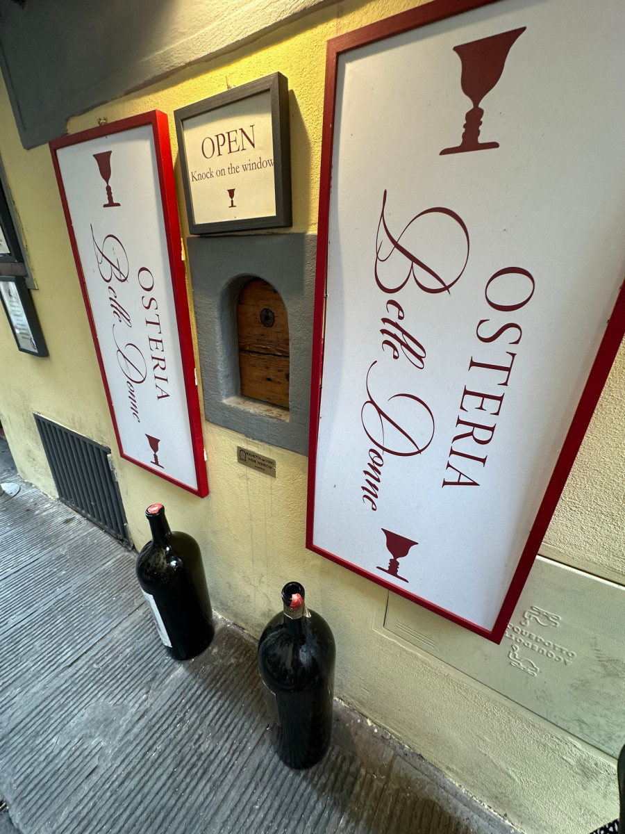 Erg grappig is het luikje waar we op kloppen en we een glas wijn bestellen die we op straat leeg drinken. Dat is weer eens wat anders dan een kroket uit de muur.