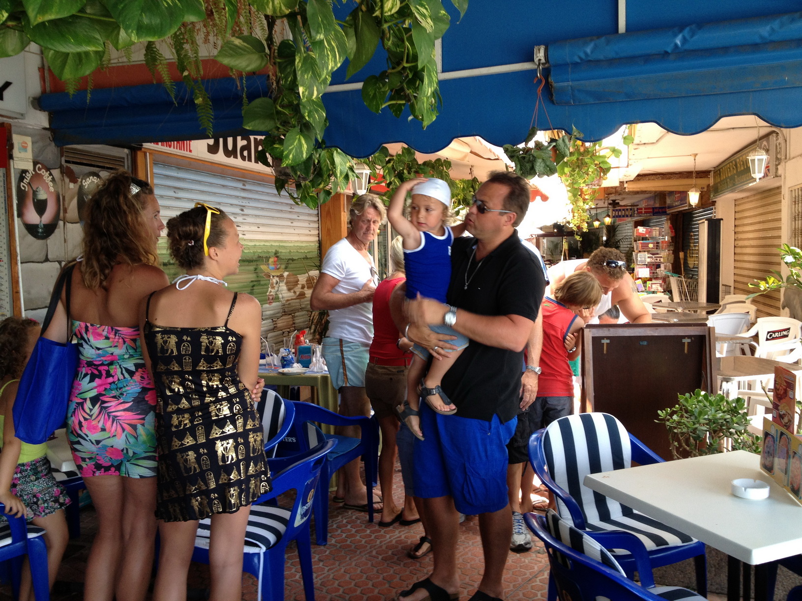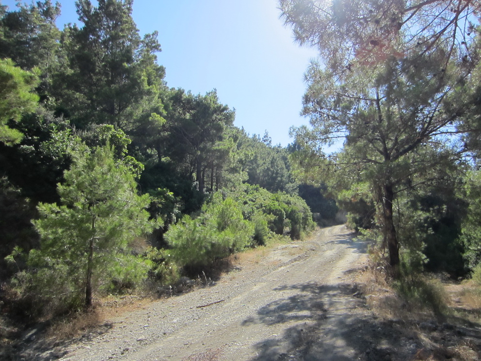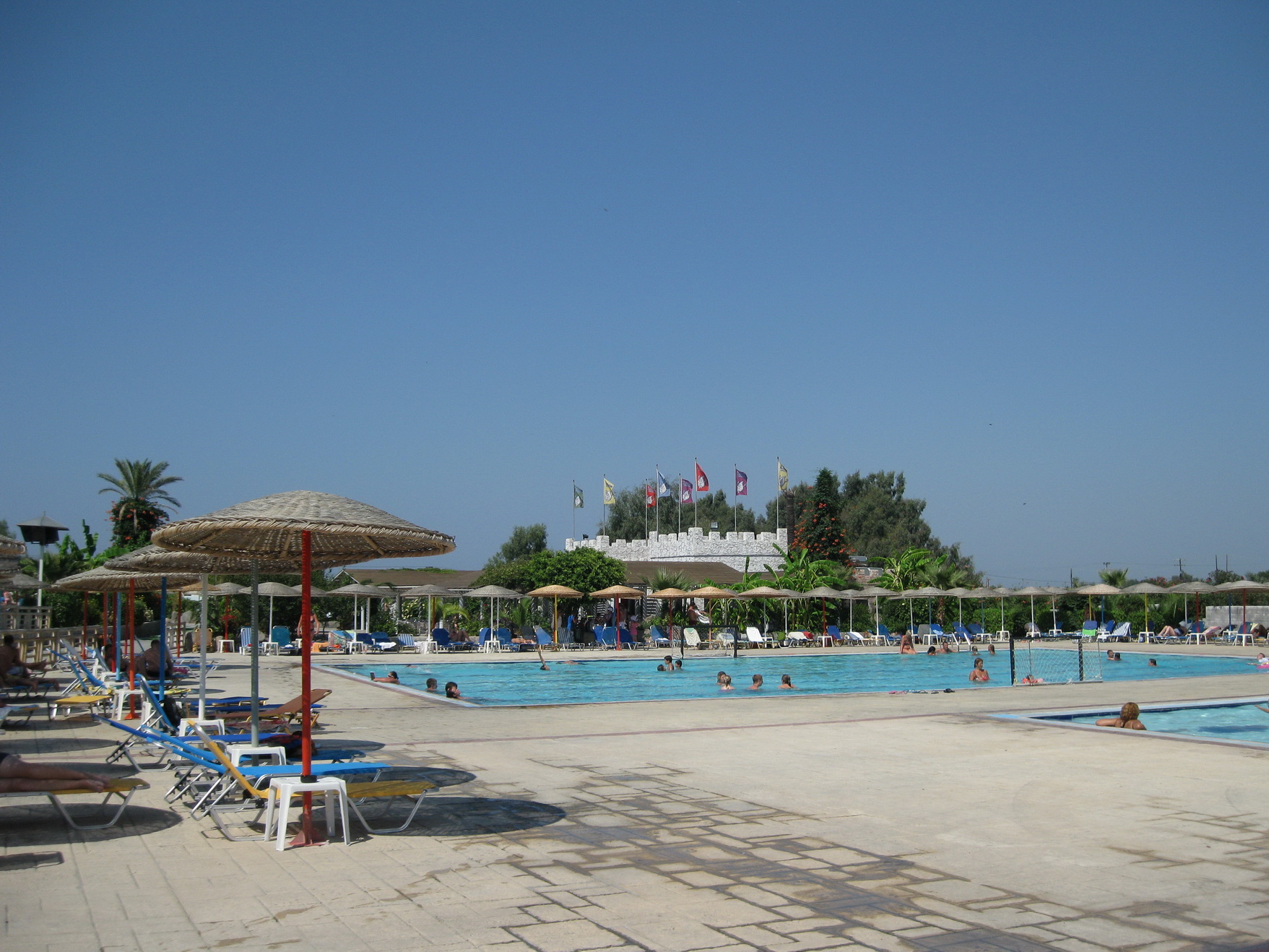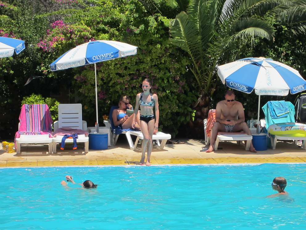 Bij dit zwembad zit trouwens ook een ontzettend leuk en gezellig terrasje. Dat de kinderen willen zwemmen komt goed uit, want dan kunnen Diana en ik op pad om wat excursies te regelen. We regelen dit bij een winkeltje van Captain Tours die we de vorige dag gezien hebben op straat. Deze is voor dezelfde excursies als de hostess aanbied ongeveer 6 à 7 Euro per persoon goedkoper. Bij het onderhandelen van de prijs blijkt hier weinig rek meer in te zitten, maar ze kan wel gratis tickets aanbieden voor de Rhodes City Tour in Rhodos Stad. Deze kosten normaal gesproken ook Euro 9,= voor volwassenen en Euro 5,= voor kinderen en dat is toch weer mooi meegenomen.Na terugkomst van het regelen van de excursies halen we nog wat boodschappen en gaan hierna een broodje eten. We spreken af dat we wat later in de middag op zoek gaan naar de eerste geocache (GC1XGHG Filerimos) die op de heuvels van Filerimos ligt, wat ongeveer 2.5 km van ons appartement verwijderd is. Het lastige is echter dat dit een hemelsbrede afstand is en met bergen weet je het dan nooit. Dat zal later wel blijken.