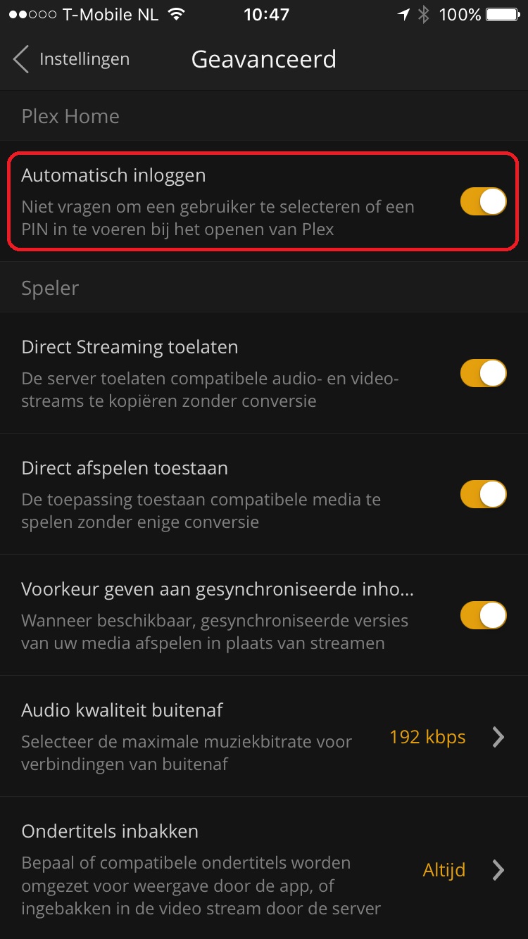 Als je Plex via je IOS App benadert dan kun je hier de gegevens voor de betreffende gebruiker invullen. Het is handigs om in je App in te stellen dat hij elke keer automatisch inlogt. Dit doe je bij de ‘Advanced’ instellingen.