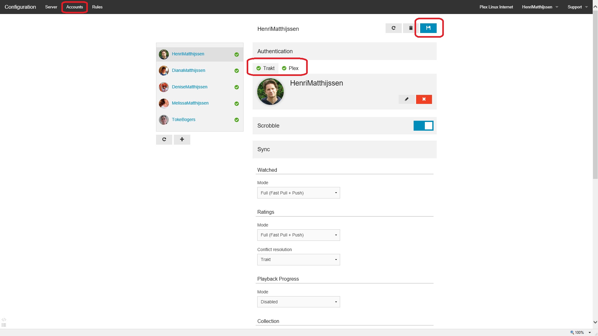 Ga hier elke user af en log in met je Plex en Trakt credentials (UserName/Password) voor die gebruiker. Dit gaat het handigste door bij ‘Mode’ voor ‘Basic’ te kiezen. Vergeet niet om je instellingen te saven bovenaan met de blauwe button. Uiteindelijk moet elke gebruiker een groen vinkje krijgen.