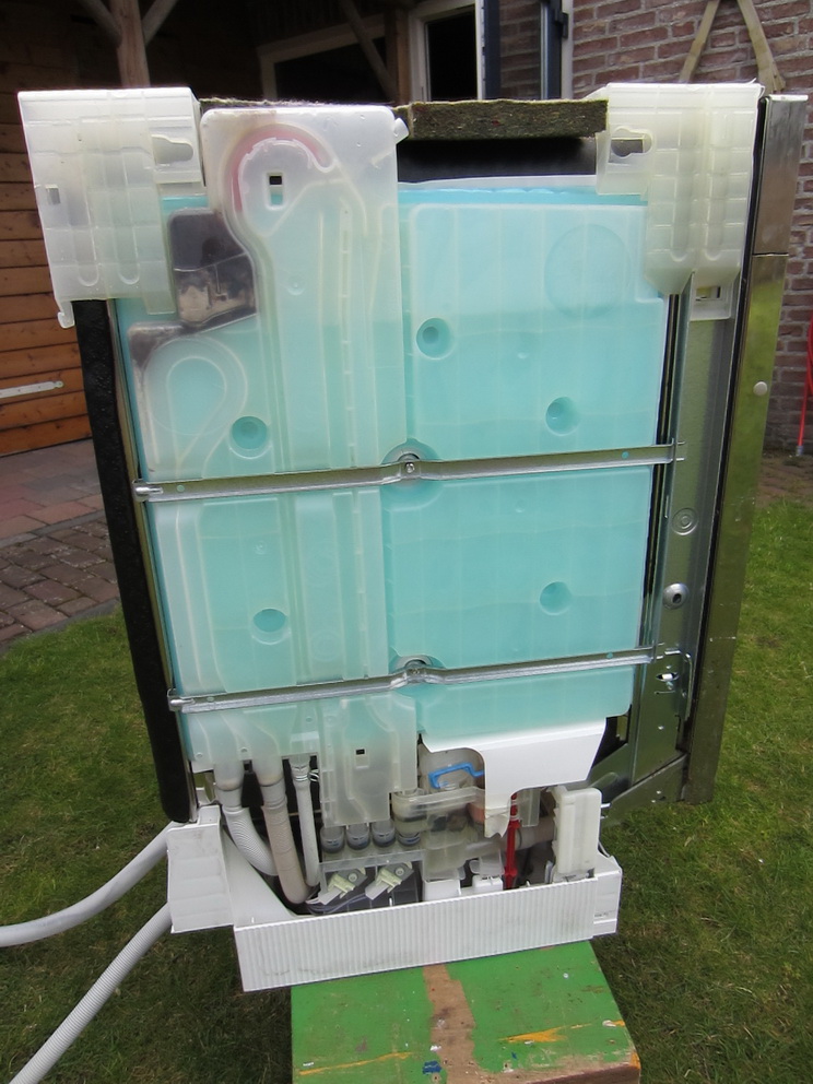 Nu gingen we eens kijken of de vaatwasser voor de rest nog goed werkte. Helaas bleek deze bij het starten van een programma geen water meer aan te zuigen. Er was dus duidelijk meer aan de hand. Weer wat verder zoeken op Internet leverde op dat dit een redelijk bekend probleem is. Vaak zitten er dan een aantal verstoppingen in het niveausysteem. Het was dus zaak om hier bij te komen. Hiervoor moet je de vaatwasser uitbouwen.