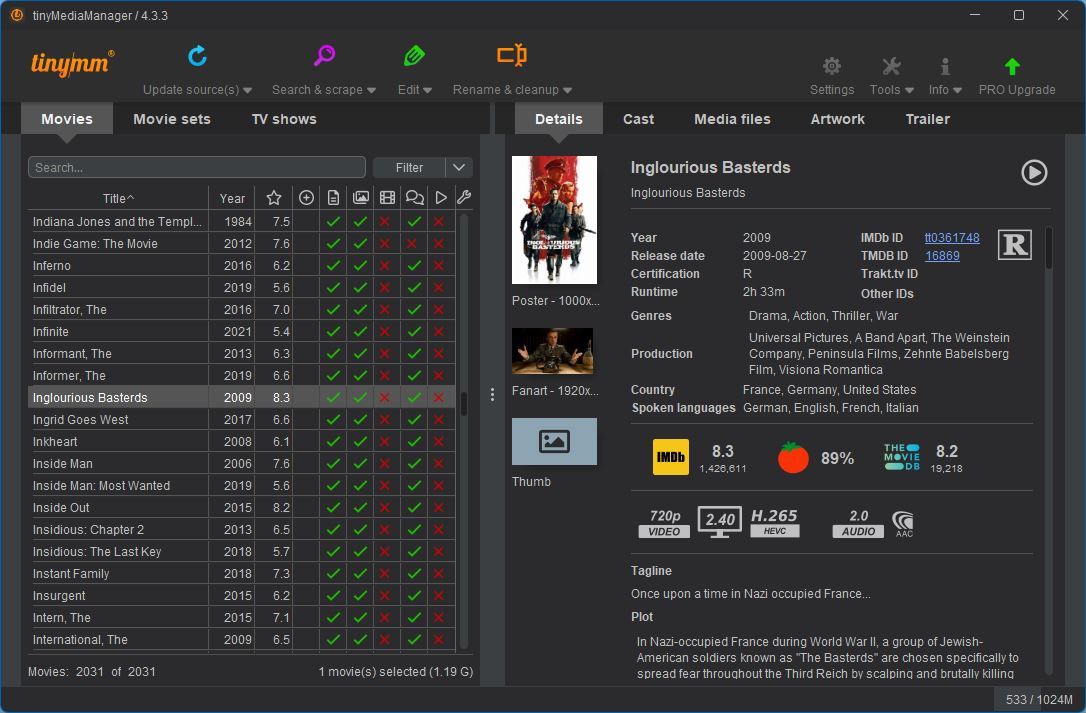 tinyMediaManager is een uitstekende tool om allerlei extra informatie voor je media bibliotheek te vinden. Je merkt meteen dat over elke functie van dit programma goed is nagedacht. De gratis versie is voor bijna iedereen eigenlijk wel voldoende. Wil je de makers ondersteunen dan kun je de Pro versie aanschaffen die nu US$ 10,= per jaar kost en meer informatie-bronnen ondersteunt (denk aan o.a. IMDB).