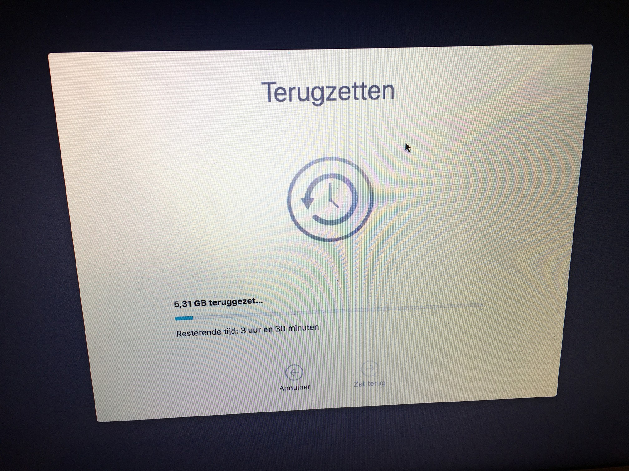 Helaas werkte de originele procedure niet, op het punt dat je van TimeMachine wilt restoren bleef ie maar roepen dat het niet kon en dat je eerst de migration assistant moest installeren.