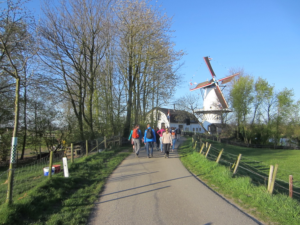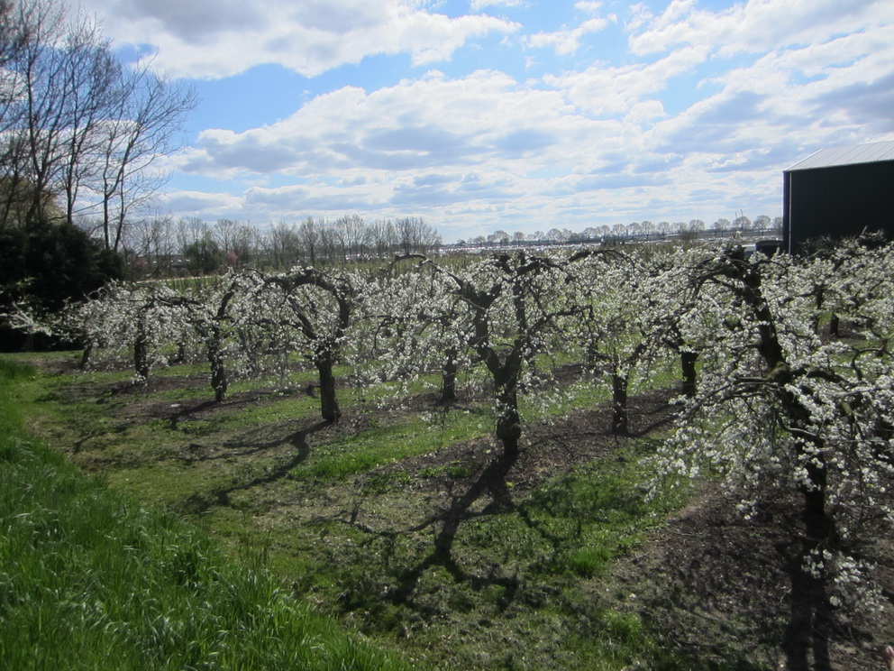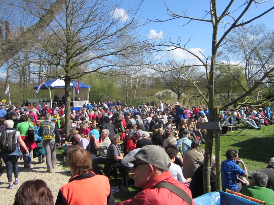 Aangezien we al om 7:00 uur mochten vertrekken met wandelen moesten we vroeg uit de veren en na Jacqueline en Yvonne tussen 5:30 en 6:00 opgehaald te hebben waren we zo in Geldermalsen. Je ziet al meteen dat dit een erg volwassen evenement is, want alles is super goed geregeld. Nadat ons ticket was ingescand konden we beginnen met wandelen. Er viel ontzettend veel te zien onderweg. Verder mochten we bij deze tocht speciaal over prive terrein lopen zoals dijkjes. Onderweg hebben we vele dieren gezien, zoals koeien, bokken, kamelen (!), ooievaars, ezels en kippen. Ook kwamen we vele ouderwetse hooizolders tegen. Er viel ontzettend veel te genieten tijdens de wandeling. Dit is echt een schitterend gebied en je ziet ook veel Bed & Breakfast gelegenheden. Onderweg hebben we diverse ooievaarsnesten gezien inclusief echte ooievaars. Er waren erg veel rustpunten onderweg met terrasjes waar je op je gemak kon gaan zitten. Ook was er onderweg op diverse plaatsen live muziek van harmonies, bandjes en koortjes. De rivier de Linde hebben we tijdens de tocht diverse malen overgestoken waarbij ook enkele bruggen waren die speciaal voor deze dag door militairen waren aangelegd. Het was opvallend hoe netjes en onderhouden alle huizen onderweg waren. We hebben schitterende leuke huisjes gepasseerd. Helaas was op veel plekken dit jaar de bloesem nog niet uitgeschoten. Daarvoor waren we denk ik nog net 2 weken te vroeg. Toen we dan ook eindelijk een boompje met bloesem zagen moest er natuurljk meteen een foto gemaakt worden. We hebben diverse leuke dorpjes gepasseerd waarbij de een nog leuker was dan de andere. In de dorpjes was meestal van alles te doen en vond je ook rustposten. Je merkt wel dat dit een erg populaire tocht is. Dit jaar had de bloesemtocht een record aantal van 31.515 deelnemers. Hiermee is de Rode Kruis Bloesemtocht officieus het grootste eendaagse wandelevenement van Nederland. Het grote aantal deelnemers merkte je wel bij de rustposten waarbij verschillende afstanden elkaar kruisten. Maar als je daar eenmaal weer voorbij was het goed te doen en kon je redelijk goed doorlopen. Iets voor 13:00 uur kwamen we bij de finish aan waarbij er feestelijk muziek werd gespeeld. Alles bij elkaar hebben we toch bijna 27½ km gelopen, maar deze waren voorbij voordat we er erg in hadden.Zaterdag 18 april: 27,45 km, 4:51:02 uur, 5,7 km/uur