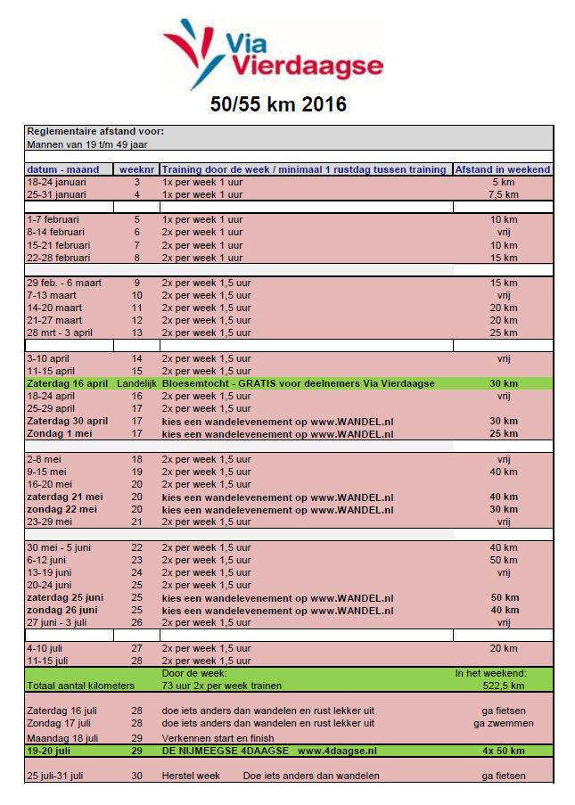 Zoals gezegd is Via Vierdaagse een speciaal trainings-programma en op de site kun je een trainingsschema downloaden waar je je aan moet proberen te houden.