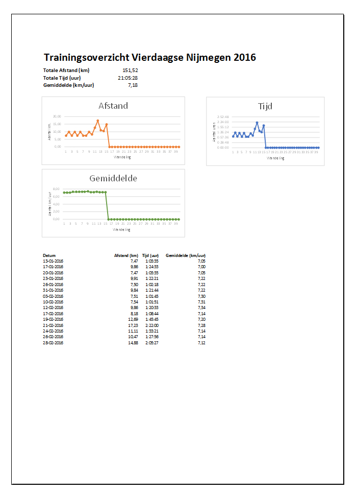 Dit kun je eventueel bijhouden in een digitaal trainings- en begeleidingsprogramma genaamd Vitalinq. Ik heb dit geprobeerd maar vind deze site een ramp (of zoals wij altijd zeggen: “veel ruimte tot verbetering”). Ik heb daarom dan ook besloten om zelf maar een Excel sheetje op te zetten waarin ik mijn wandelingen vastleg. Op deze manier heb ik ook een goed overzicht.