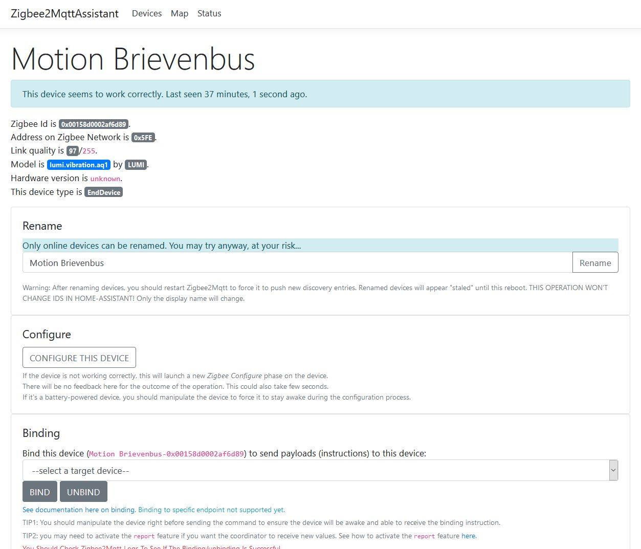 Devices verwijderen kan niet met de plugin. Normaal gesproken doe je dat door Zigbee2MQTT service te stoppen en het device dan te verwijderen uit de ‘/opt/zigbee2mqtt/data/configuration.yaml’ en ‘/opt/zigbee2mqtt/data/database.db’ file (met tekst editor).