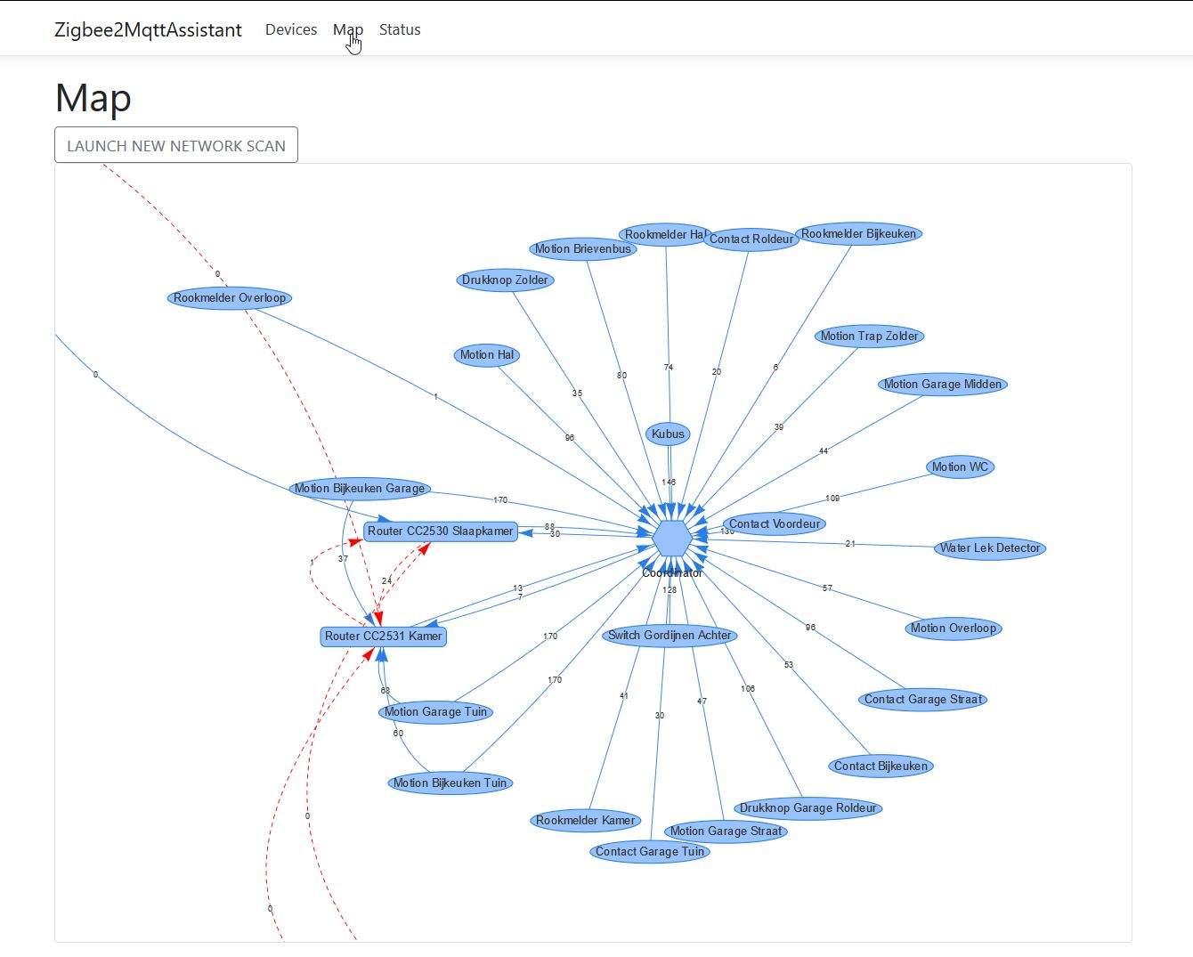 Overigens kun je sinds kort met de Zigbee2MQTT plugin ook een grafische weergave van je Zigbee apparaten tonen. Zie ook bijgevoegd screenshot.